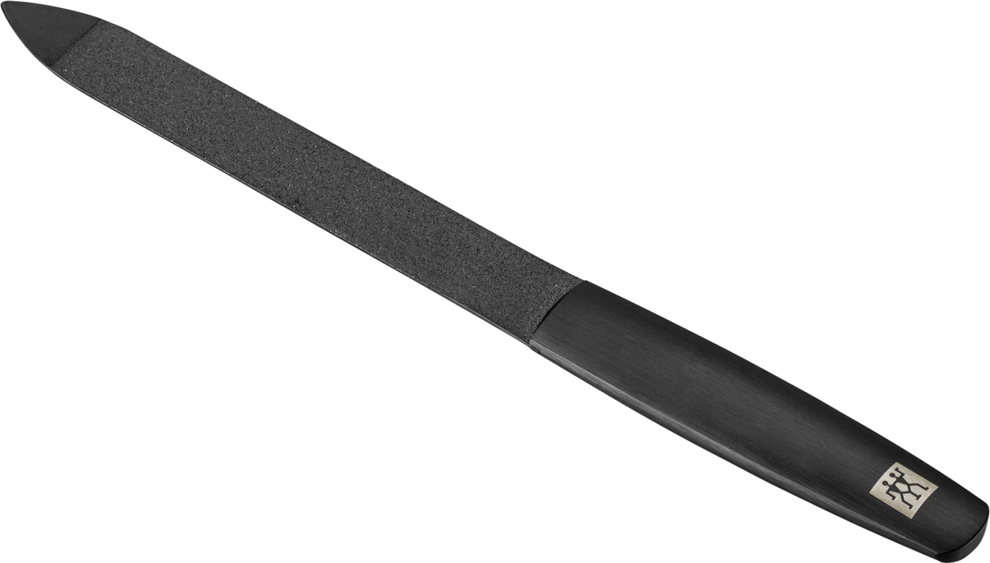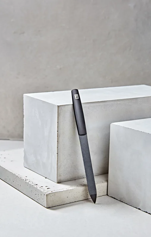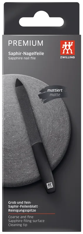 Diese Premium-Saphir-Nagelfeile in Schwarz vereint traditionelle Handwerkskunst, modernste Herstellungsverfahren und beste Materialien für höchste Ansprüche in der Körperpflege. Das Feilenblatt verfügt über eine grobe und eine feinkörnige Seite zum Kürzen und Glätten der Nägel, während die Spitze zum Reinigen dient. Die Größe und Form des Griffs ist speziell auf Männerhände abgestimmt. Durch die aufwendige mattschwarze PVD-Beschichtung werden die Kratzfestigkeit und Haltbarkeit noch weiter erhöht. Nagelfeilen gehören zu den wichtigsten Maniküre-Werkzeugen. Durch regelmäßiges Feilen bleiben Länge und Form der Nägel erhalten. Die Feile sollte direkt am Nagel angesetzt und nur in eine Richtung bewegt werden. Die grobkörnige Seite schneidet und formt den Nagel und die feinkörnige Seite glättet die Kanten und Ecken. Nach der Anwendung beugt das Auftragen eines Nagelpflegeöls oder -stifts dem Abbrechen brüchiger Nägel vor. Saphirfeilen sind grundsätzlich Sorglos-Maniküreprodukte. Wenn eine gute Feile nur zum Feilen der Nägel verwendet wird, hält sie viele Jahre. Bei häufigem Feilen kann Staub (Keratin) von den Nägeln die Oberfläche verstopfen, was zu einer weniger effizienten Feilung führt. Nagelfeilen lassen sich ganz einfach mit einer Handfeile unter fließendem Wasser reinigen (bei Bedarf mildes Reinigungsmittel hinzufügen). Es ist wichtig, die Feile sorgfältig mit einem fusselfreien Handtuch oder sogar einem Fön zu trocknen. Danach ist die Nagelfeile wie neu.