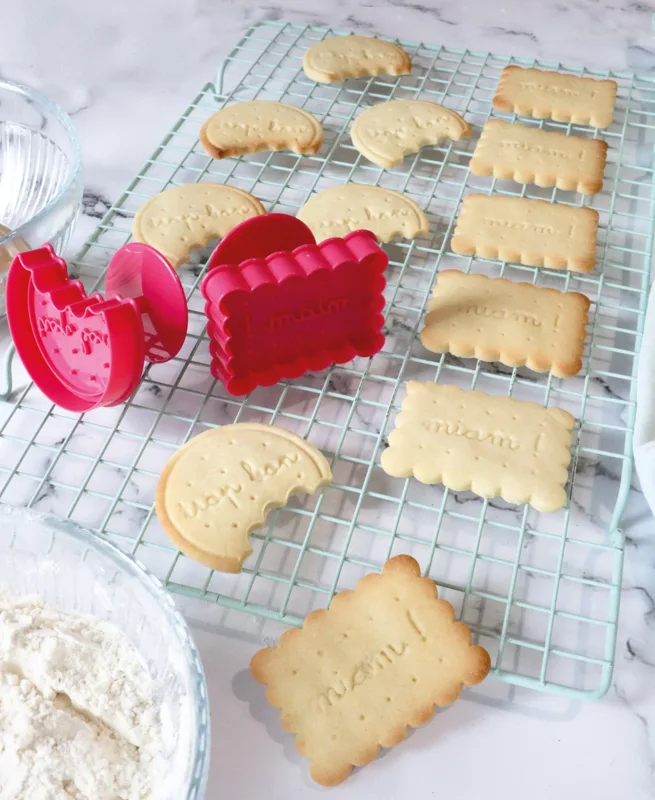 Entdecke unser Set mit 2 Ausstechformen. Ein rechteckiger Keks und ein runder Knusperkeks bilden dieses Set mit Ausstechformen. Sie sind einfach zu handhaben und werden dich mit ihrer Vielseitigkeit auf verschiedenen Teigsorten begeistern: Kekse, Zuckerteig, Marzipan oder sogar Salzteig! Reinigung: Vor dem ersten Gebrauch und nach jedem Gebrauch waschen und abwischen. Nicht spülmaschinenfest. Achtung! Ausstechformen enthalten kleine Teile, die verschluckt werden können. Kein Spielzeug. Nicht an Kinder geben oder in deren Reichweite lassen. Verletzungsgefahr und Erstickungsgefahr.