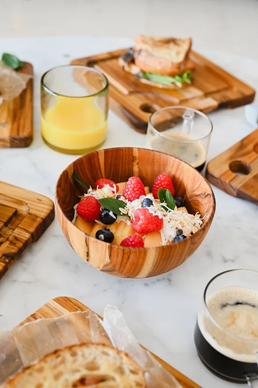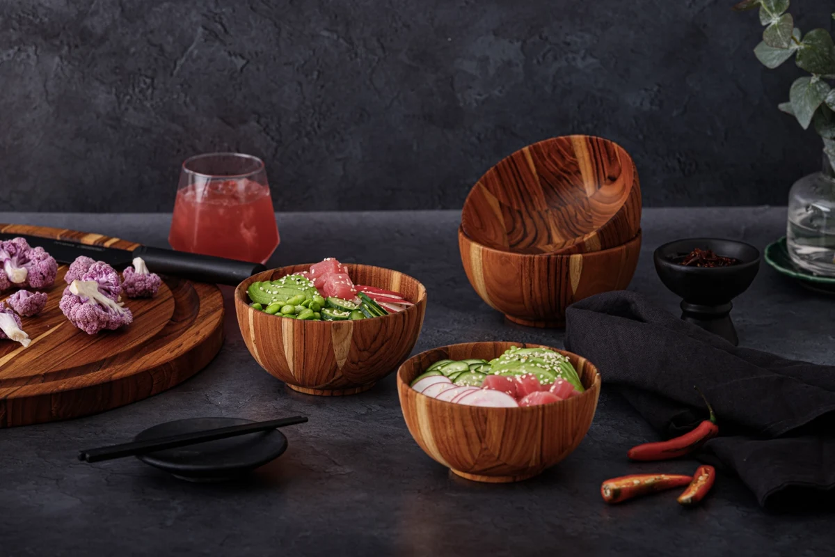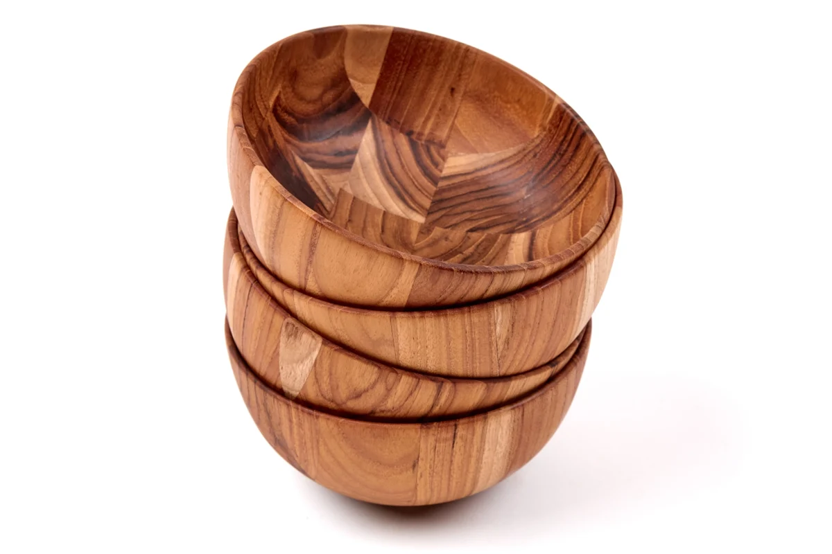 Die 4 mondförmigen Schüsseln aus Teakholz bringen Stil und Funktionalität auf jeden Tisch. Aus hochwertigem Teakholz gefertigt, sind diese Servierschüsseln ein Muss für jede Mahlzeit.
