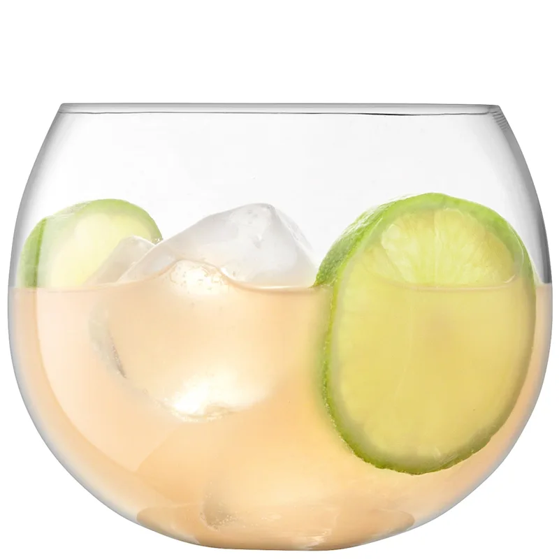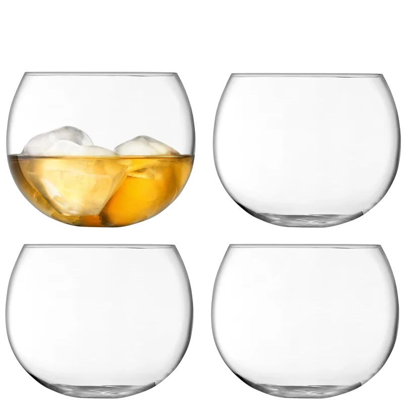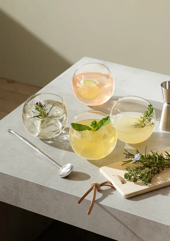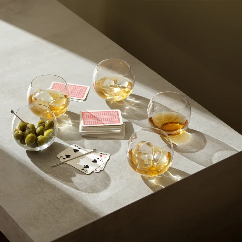 Ein Set aus vier Schaukelgläsern, die auf einem gebogenen Sockel balancieren, wodurch das Glas sanft von einer Seite zur anderen schaukelt. Die vielseitige Form kann für Whisky on the Rocks, kleine Cocktails und Wasser oder als Schale für Nüsse und Oliven verwendet werden. Spülmaschinenfest.