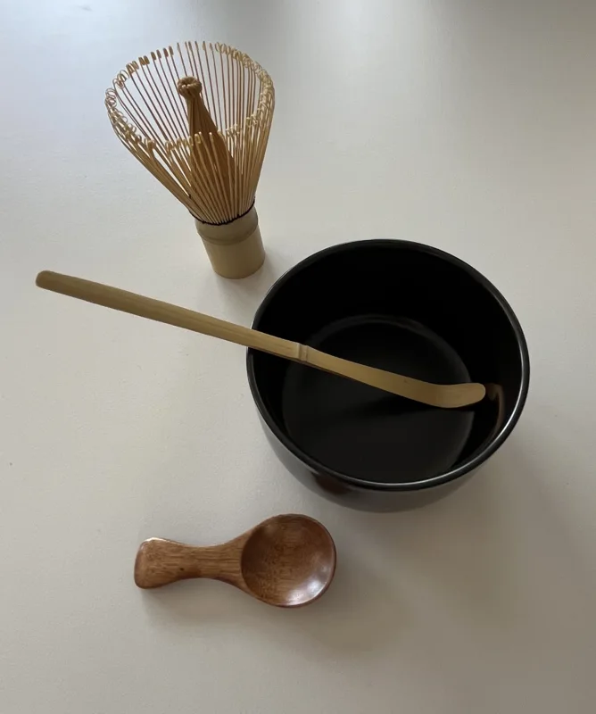Dieses Set enthält alles, was du für die Zubereitung von Matcha nach japanischer Teekultur brauchst: eine schwarz glasierte Matcha-Schale, einen Bambusbesen (Chasen), einen passenden Halter sowie einen Bambuslöffel (Chashaku). Geliefert wird das Set in einer schlichten Holzkiste, die sich auch gut zur Aufbewahrung oder als Geschenkverpackung eignet.