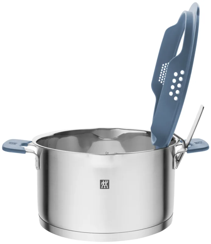 Kochen willkommen im nächsten Level: Die Serie Simplify von ZWILLING steht für Design und Funktionalität. Das 5-teilige Kochtopf-Set mit Soft-Touch-Silikon in der Farbe Taubenblau überzeugt nicht nur durch seine außergewöhnliche Optik, jeder Kochtopf des Sets begeistert auch mit innovativen Eigenschaften. Das 5-teilige Kochgeschirr-Set besteht aus je einem Kochtopf mit 16, 20 und 24 cm, einem Bratentopf mit 20 cm sowie einem Saucentopf mit 16 cm Durchmesser. Außerdem kommen alle Töpfe, mit Ausnahme des kleinen Saucentopfs, mit einem passenden Deckel. In der grauen Silikonumrandung ist ein Sieb mit zwei unterschiedlich großen Öffnungen integriert, sodass Flüssigkeit ohne zusätzliches Sieb abgegossen werden kann. Die Kennzeichnung X am Deckel markiert die optimale Deckelstellung zum Reduzieren des Dampfaustritts. Dank integrierter Deckelhalterung kann der Glasdeckel mit Abgießfunktion während des Kochens am Topf befestigt werden und muss nicht mehr umständlich zur Seite gelegt werden. Heiße Griffe beim Kochen sind mit dem Simplify Topfset mit Topfdeckelhalter auch nicht zu befürchten: Die Silikongriffe sind mit Soft-Touch-Silikon in der Farbe Taubenblau ummantelt für eine einfache Handhabung während des Kochens. Das Kochgeschirr aus 18/10 Edelstahl ist hochwertig verarbeitet und der SIGMA Classic + Sandwichboden sorgt für eine ideale Wärmeverteilung. Alle fünf Kochtöpfe sind spülmaschinengeeignet und induktionsgeeignet.