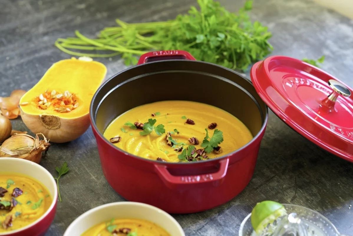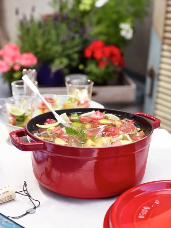 Ein saftiger Braten ist nicht nur sonntags ein kulinarischer Hochgenuss. Ob Fleischgerichte, Gemüseauflauf oder Fisch in der Cocotte von Staub gelingen Ihnen feine Gerichte einfach und sicher. Die Cocotte ist ein gusseiserner Bräter, den Sie zur schonenden Zubereitung verschiedener Speisen verwenden können. Der Schmortopf ist dank seines klassischen Designs mit geprägtem Namen und einem silberglänzenden Knauf ein Kochgeschirr, in welchem Sie Ihre Gerichte zudem stilvoll am Tisch servieren. Die Cocotte hat einen Durchmesser von 24 cm, mit Griffen beträgt er rund 30 cm. Mit Deckel ist der Schmortopf von Staub etwa 15 cm hoch. Er hat ein Fassungsvermögen von 3,7 l. Die gusseiserne Cocotte ist auf der Innenseite mit einer mattschwarzen Emaillierung überzogen. Diese verleiht dem Gargut beim Anbraten ein hervorragendes Schmoraroma und verstärkt den Eigengeschmack der frischen Zutaten. Die Cocotte selbst speichert die Wärme und gibt sie langsam ab. So bleiben Ihre Speisen auch auf dem Tisch noch lange warm. Das gusseiserne Kochgeschirr von Staub eignet sich für die Zubereitung zahlreicher Gerichte. Mit der kirschroten Cocotte sorgen Sie auf Ihrem Tisch für einen stilvollen Blickfang und ergänzen Ihr Kochgeschirr um einen funktionalen, robusten und pflegeleichten Schmortopf, den Sie sicher zu vielen Gelegenheiten benutzen werden.