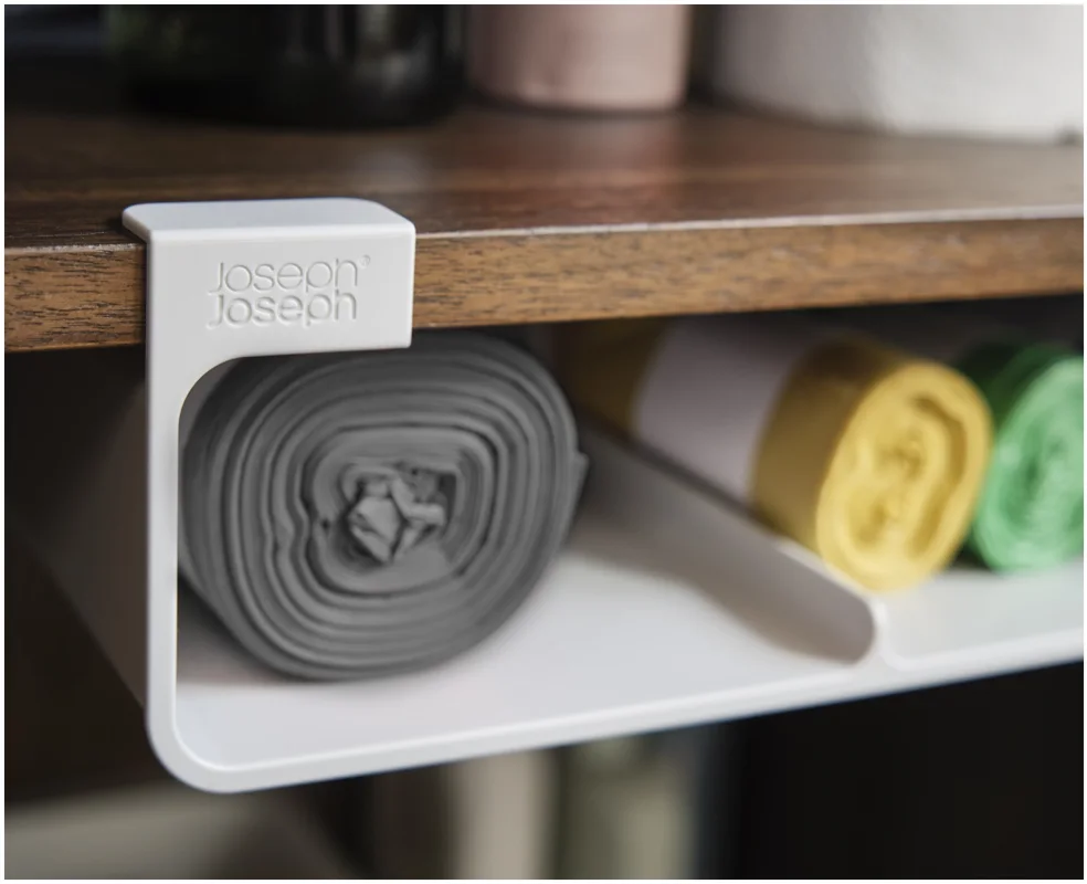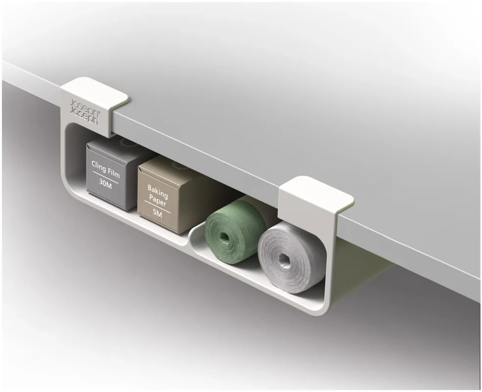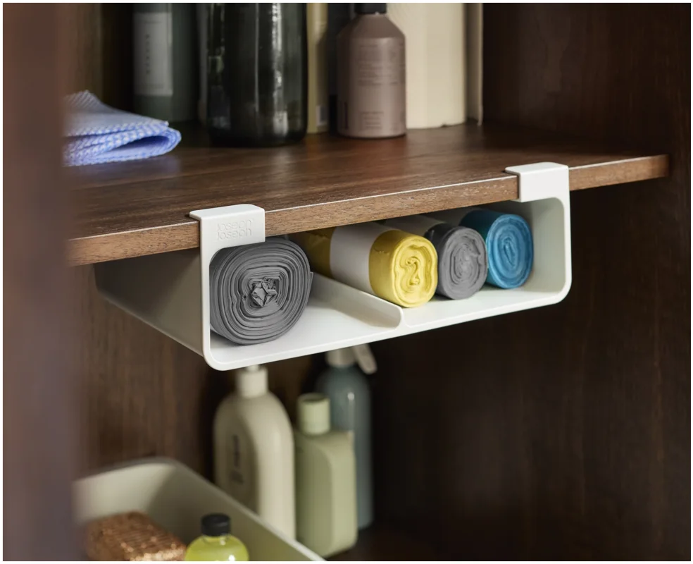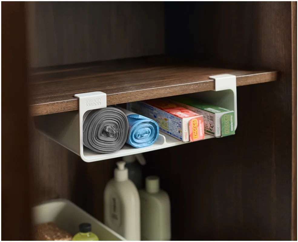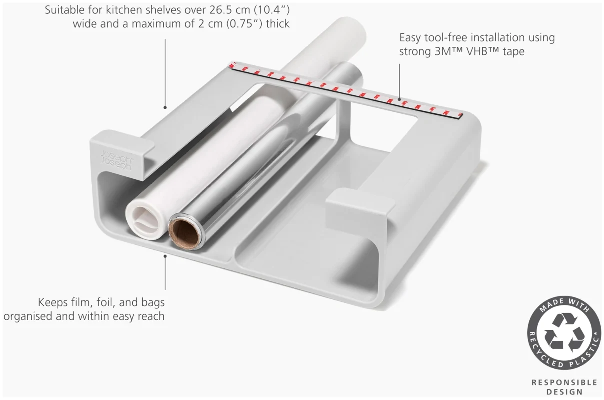 Nutze ungenutzten Schrankraum mit diesem Folien-, Beutel- und Rollen-Organizer zur Montage unter Regalen. Für Standardgrössen geeignet, werkzeuglos dank 3M VHB-Klebung oder optional Schrauben. Aus mindestens 50 % recyceltem Kunststoff. Masse: H 9 × T 22 × B 26,3 cm.