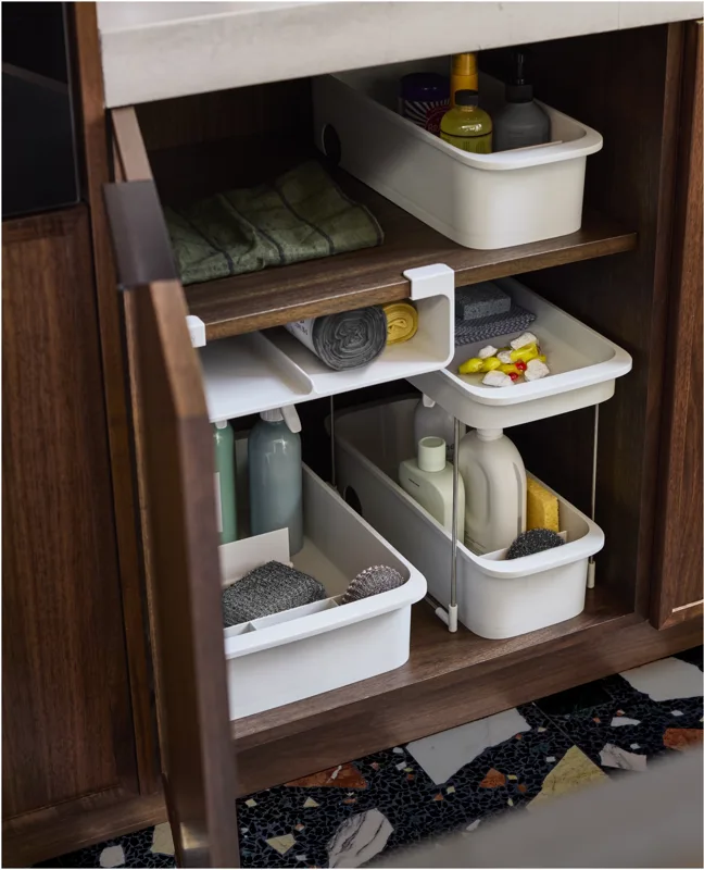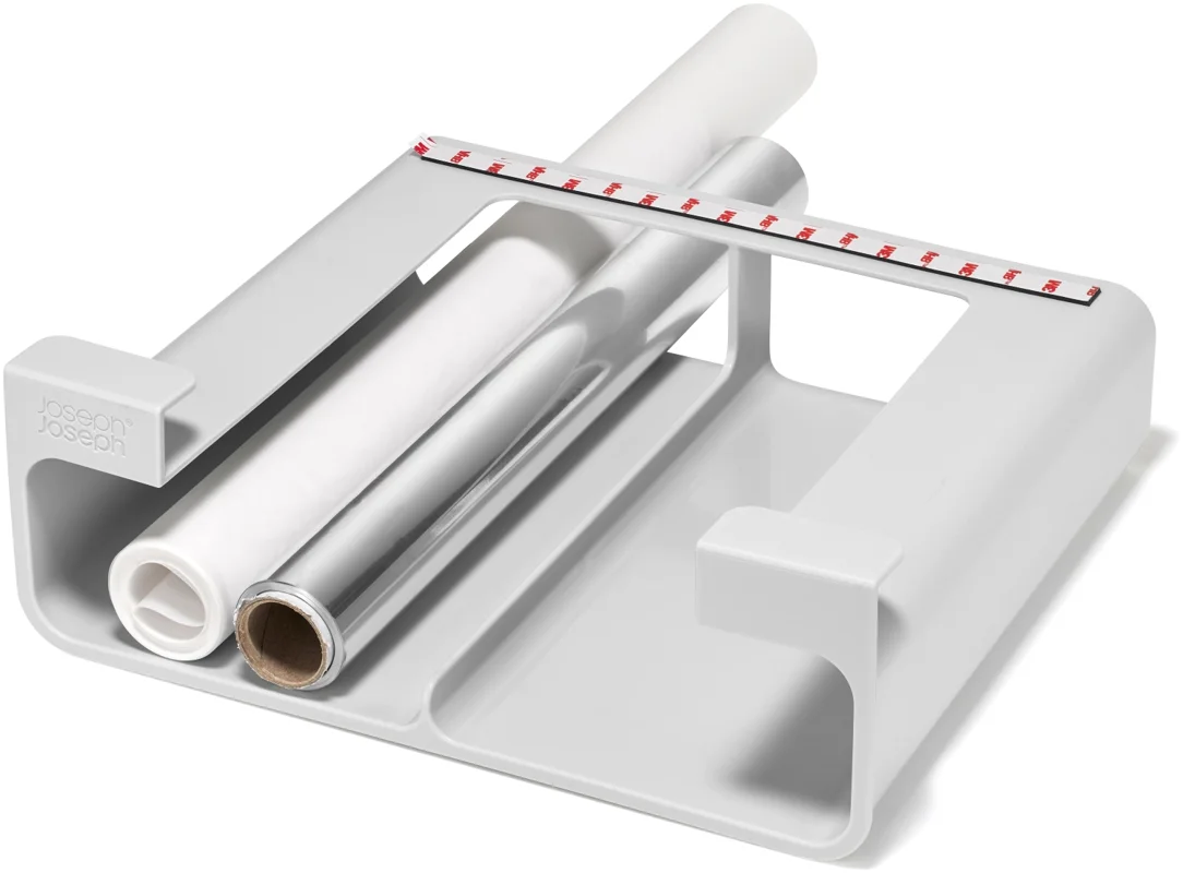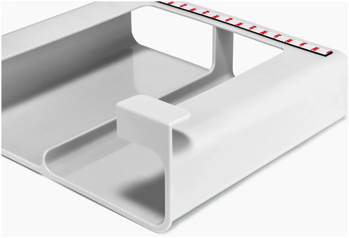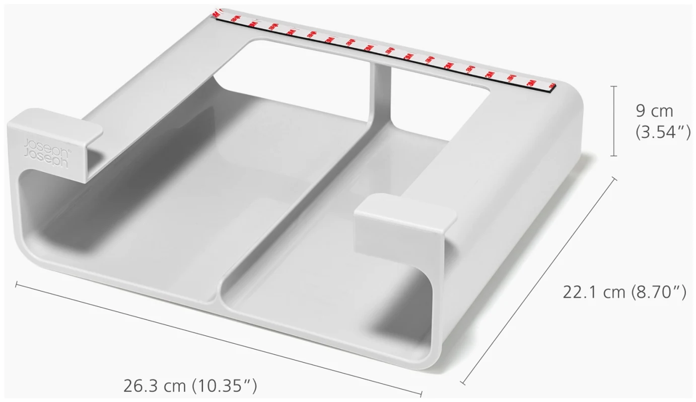 Nutze ungenutzten Schrankraum mit diesem Folien-, Beutel- und Rollen-Organizer zur Montage unter Regalen. Für Standardgrössen geeignet, werkzeuglos dank 3M VHB-Klebung oder optional Schrauben. Aus mindestens 50 % recyceltem Kunststoff. Masse: H 9 × T 22 × B 26,3 cm.