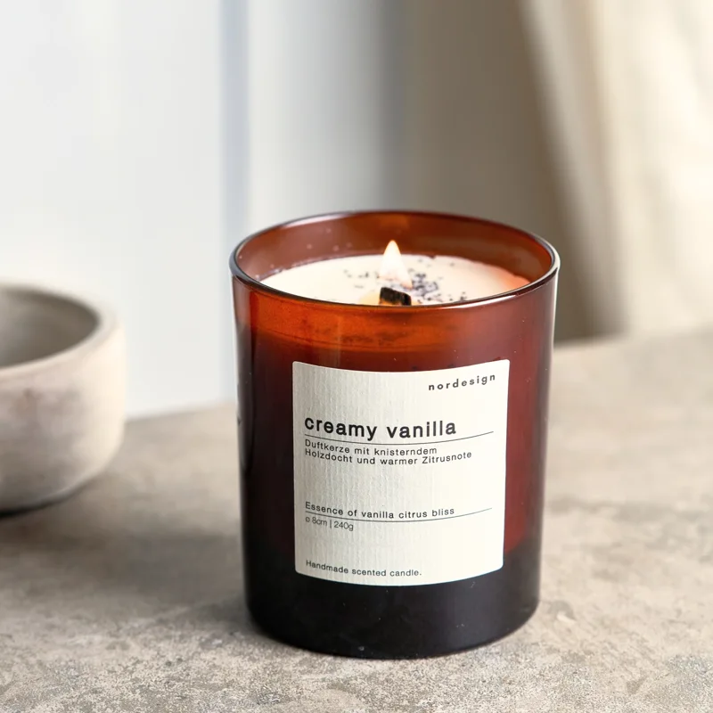 Ihre minimalistische Kerze aus 100% natürlichen Inhaltsstoffen für Ihr Zuhause. Unsere Duftkerze in einem schlichten, schönen Braunglasgefäß passt sich Ihren Bedürfnissen an: Für einen entspannten Abend auf dem Sofa, zum Beseitigen unangenehmer Gerüche nach dem Kochen oder einfach als Design-Element in Ihrem Zuhause.Jede Kerze wird in einem kleinen Familienbetrieb in Deutschland handgefertigt und ist somit ein Einzelstück. Sie können zwischen Nordic Forest (einem erfrischenden Duft, der die würzige Frische von Tannennadeln mit der belebenden Reinheit von Eukalyptus kombiniert und so eine beruhigende Waldatmosphäre schafft) oder Creamy Vanilla (ein dezenter Duft, der die Wärme von Vanille mit einer frischen Zitrusnote verbindet, eingehüllt in die cremige Süße von Karamell) wählen.Ihre Kerze kommt liebevoll und sicher verpackt in den Abmessungen: 8,5 cm (Höhe) & 8 cm (Durchmesser) mit einem Füllgewicht von 240 g und einer Brenndauer von ca. 30 Stunden bei Ihnen an.Das minimalistische Glasgefäß ist nach vollständigem Entfernen des Wachses wiederverwendbar, z. B. als kleiner Blumentopf oder als Vase. Alternativ können Sie das Glas zurück in den Recycling-Kreislauf geben.