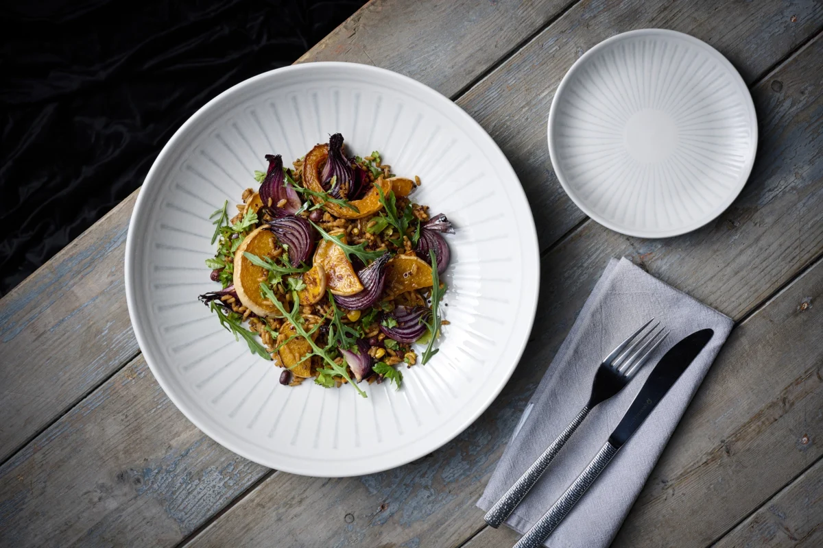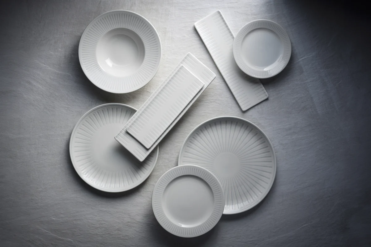 Das Era-Design erzeugt eine Retro-Atmosphäre mit seinem Radialdruck, der von der Mod-Subkultur der 1950er und 1960er Jahre inspiriert ist. Das Era-Muster ist eine ideale Plattform für Lebensmittel und bildet den perfekten Rahmen für die kreative Komposition eines Kochs.