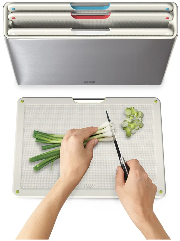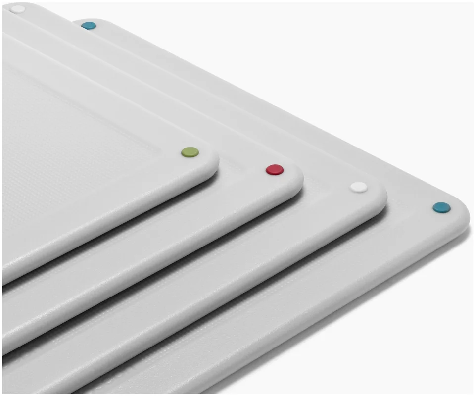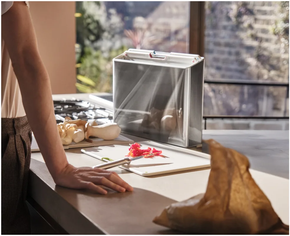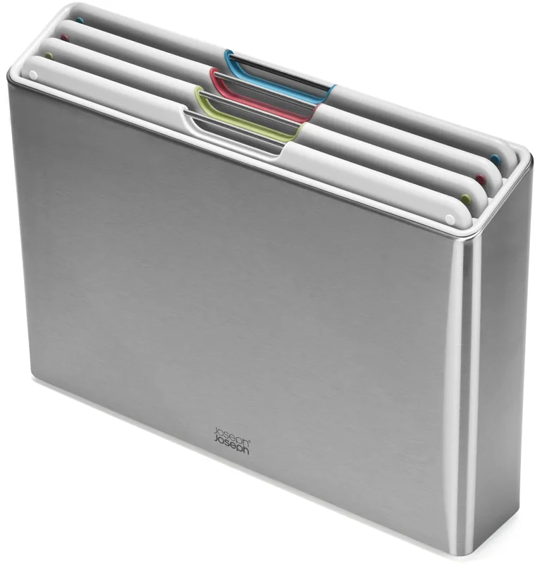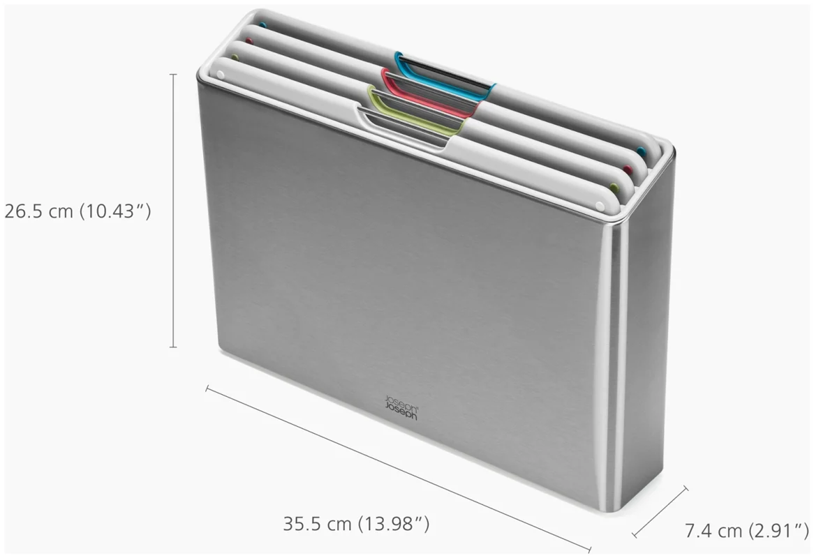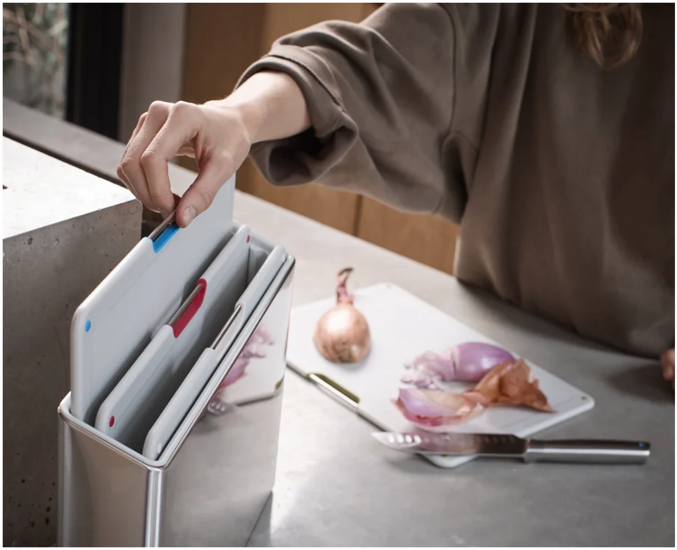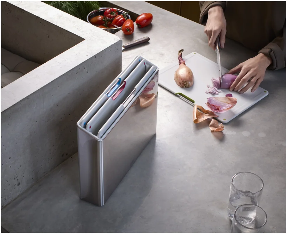 Mehrere Schneidebretter sind praktisch, aber schwieriger zu verstauen. Darum haben wir Folio entwickelt. Dieses Set aus vier Schneidebrettern wird in einem eleganten Edelstahlgehäuse aufbewahrt und hält deine Arbeitsfläche ordentlich. Jedes Brett hat auf beiden Seiten eine messerschonende, strukturierte Oberfläche und rutschfeste Füsse. Subtil farbcodierte Bretter und Füsse helfen, Kreuzkontamination zu vermeiden, und Edelstahl-Auswahlleisten erleichtern das Herausziehen. Das fingerabdruckresistente Gehäuse trennt die Bretter, sodass Luft zirkuliert und sie effizient trocknen. Brettgrösse: 24,0 × 34,0 cm (9,5 × 13,3 Zoll).