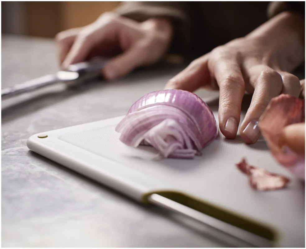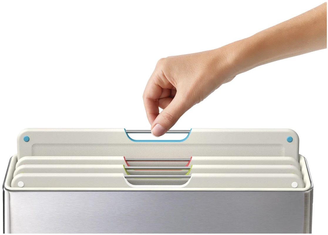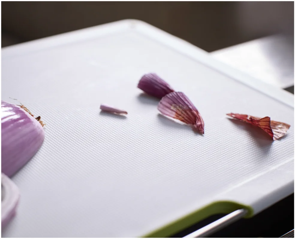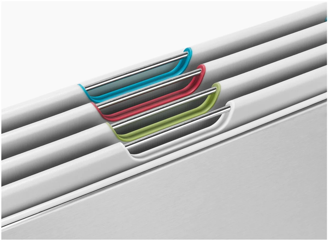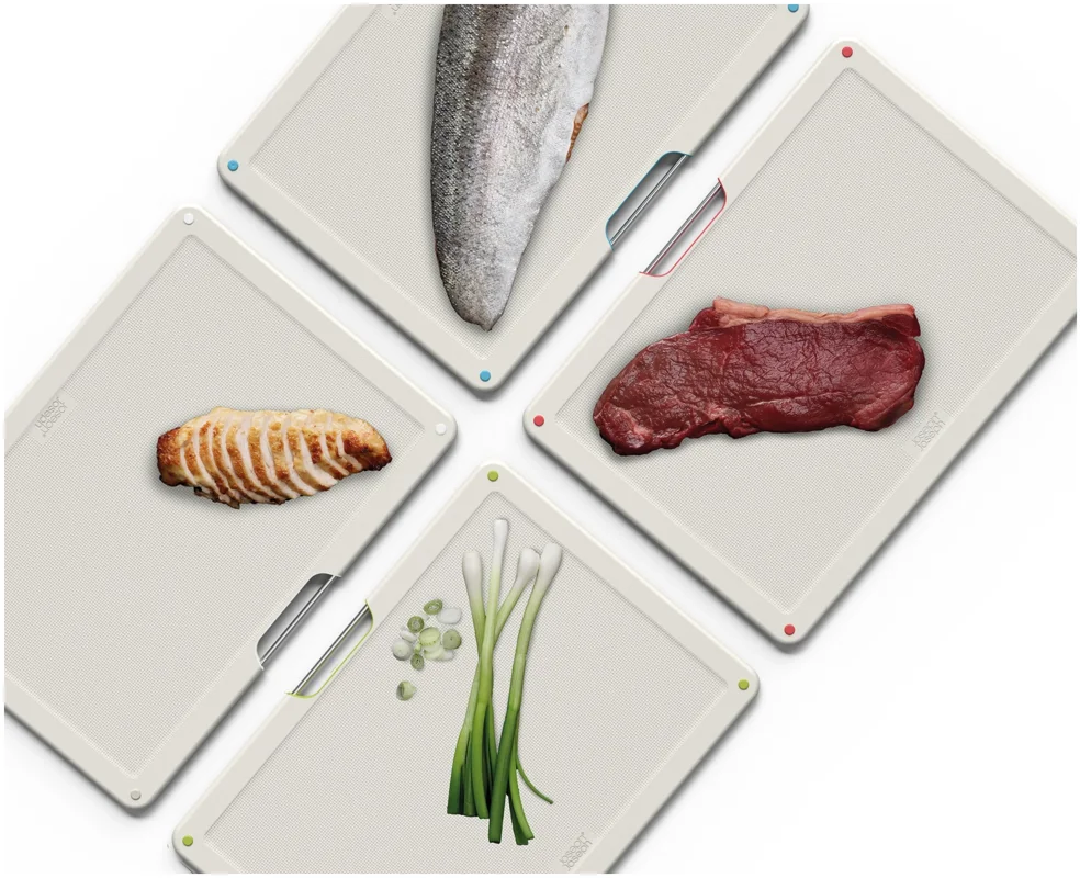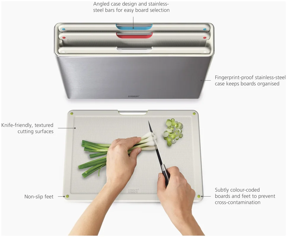 Mehrere Schneidebretter sind praktisch, aber schwieriger zu verstauen. Darum haben wir Folio entwickelt. Dieses Set aus vier Schneidebrettern wird in einem eleganten Edelstahlgehäuse aufbewahrt und hält deine Arbeitsfläche ordentlich. Jedes Brett hat auf beiden Seiten eine messerschonende, strukturierte Oberfläche und rutschfeste Füsse. Subtil farbcodierte Bretter und Füsse helfen, Kreuzkontamination zu vermeiden, und Edelstahl-Auswahlleisten erleichtern das Herausziehen. Das fingerabdruckresistente Gehäuse trennt die Bretter, sodass Luft zirkuliert und sie effizient trocknen. Brettgrösse: 24,0 × 34,0 cm (9,5 × 13,3 Zoll).