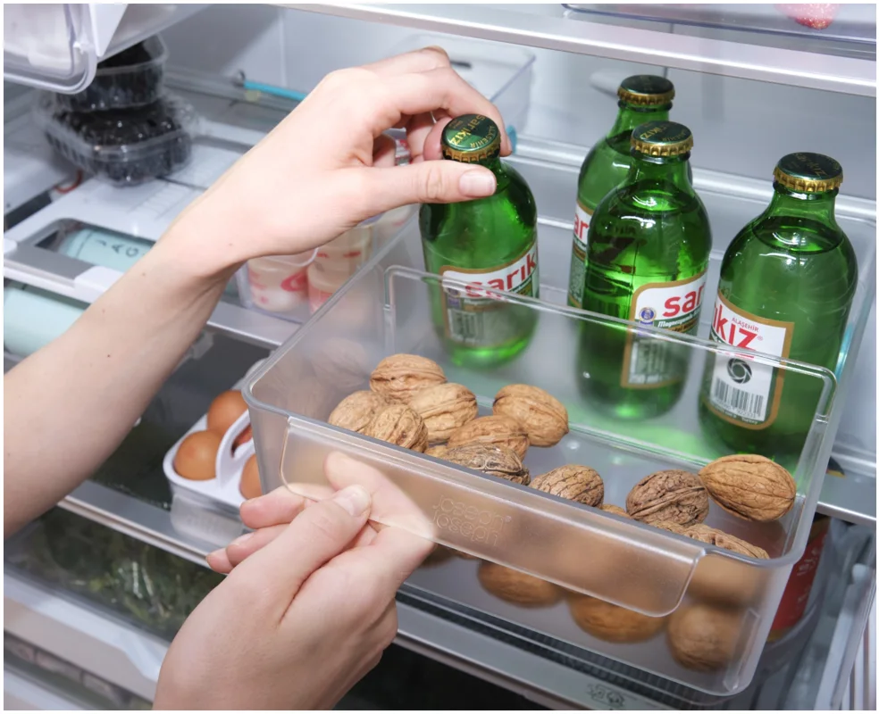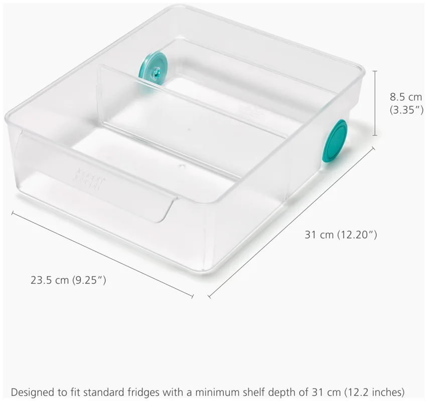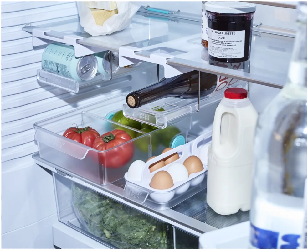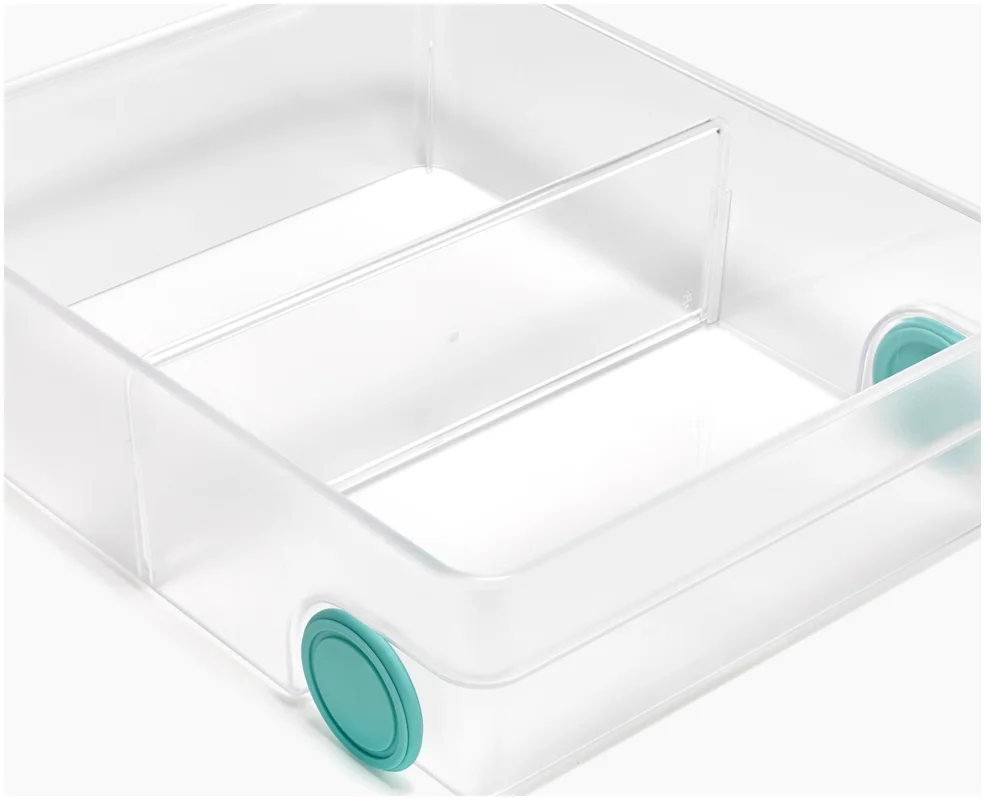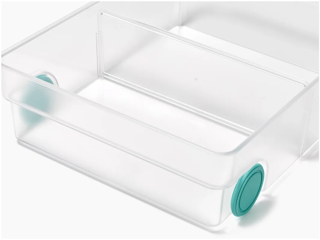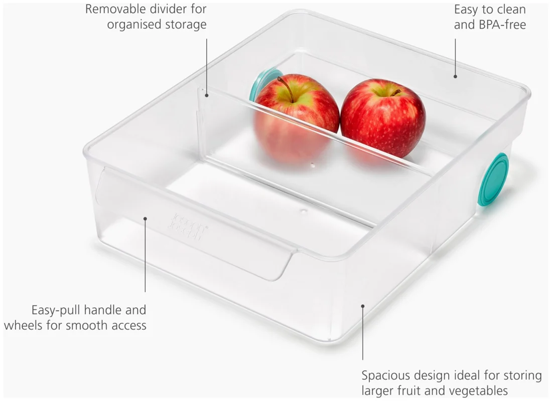 Dieses grosszügige Design ergänzt deinen Kühlschrank um eine zusätzliche Schublade. Mit Frontgriff und Rollen lässt sie sich leicht herausziehen. Ein herausnehmbarer Trenner sorgt für Ordnung. Ideal für Obst, Gemüse, Gläser und mehr.