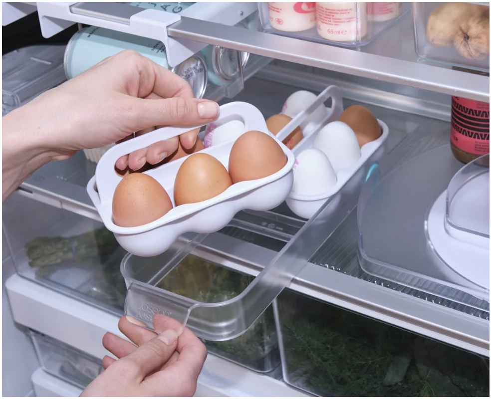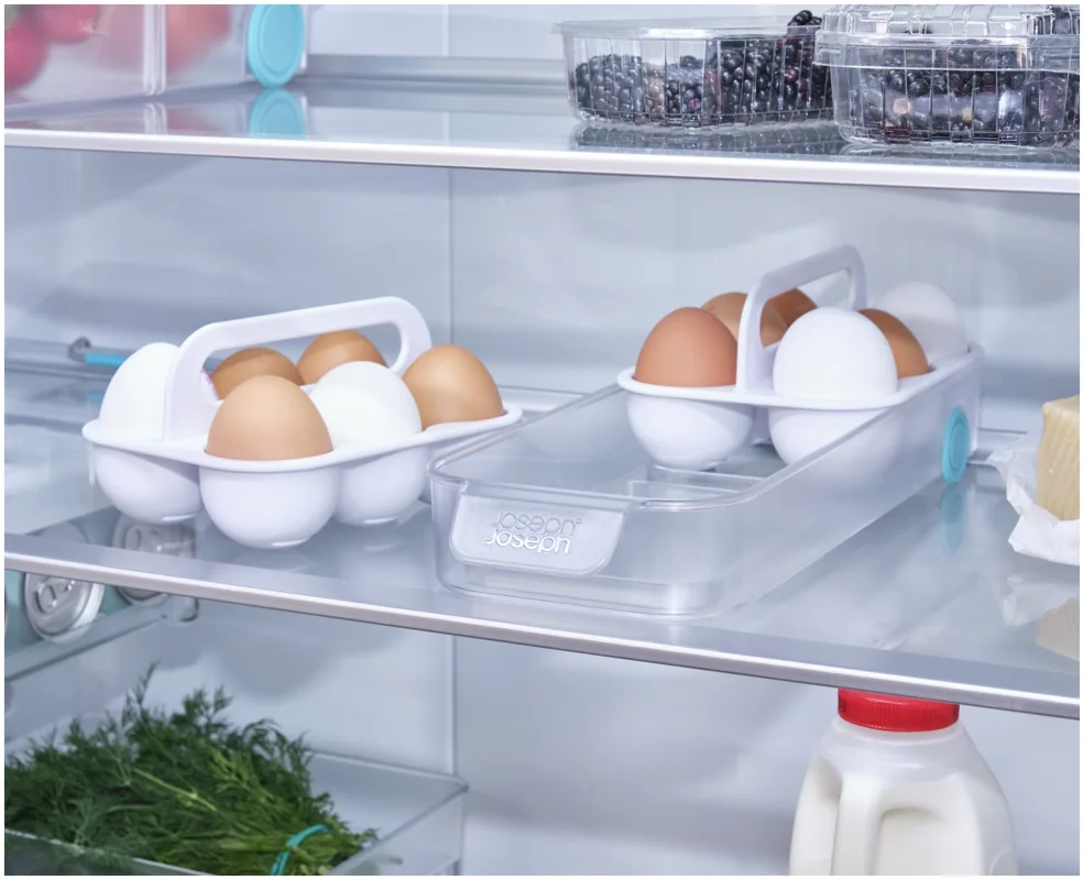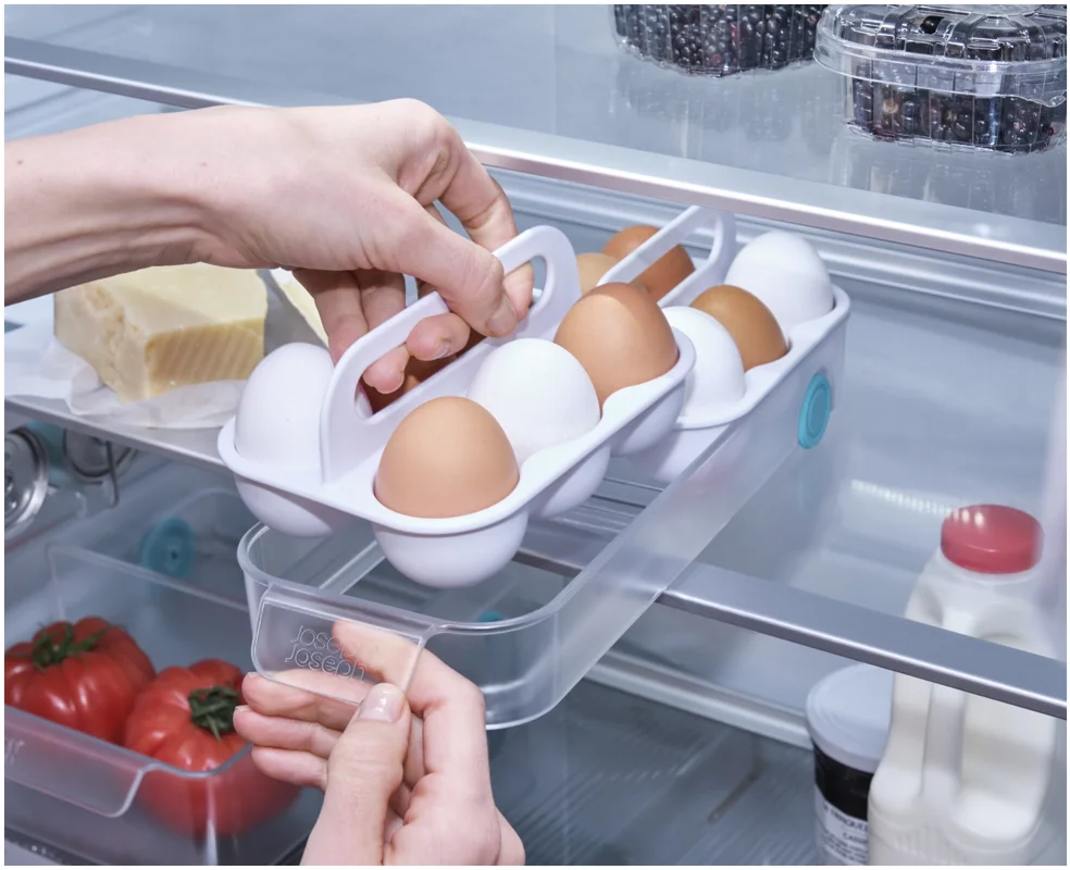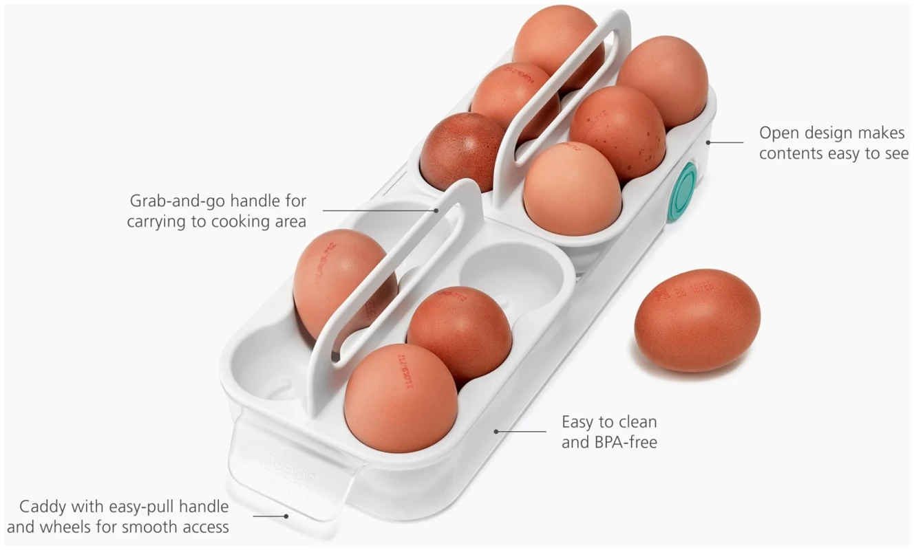 Kartoneierschachteln können feucht werden und zerfallen. Dieses Design bietet eine bessere Lösung: Zwei Tabletts fassen je sechs Eier, bleiben übersichtlich und sitzen in einem leichtgängigen Schlitten mit Frontgriff. Mit Tragegriffen für den Transport zur Kochstelle.