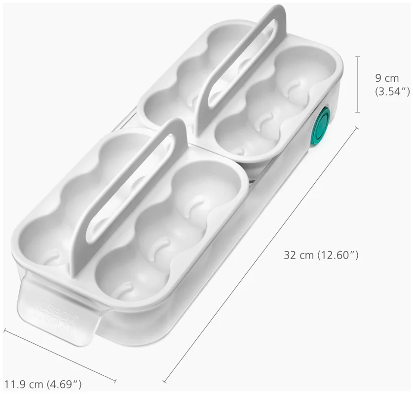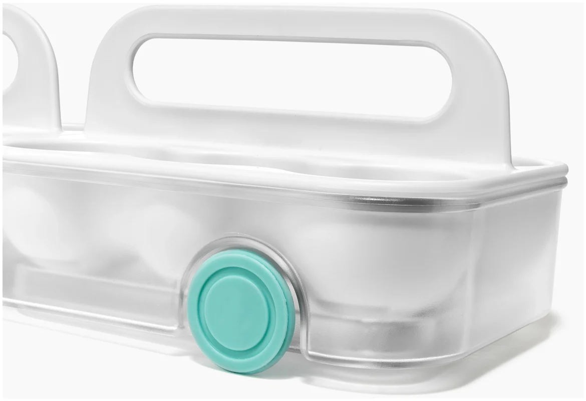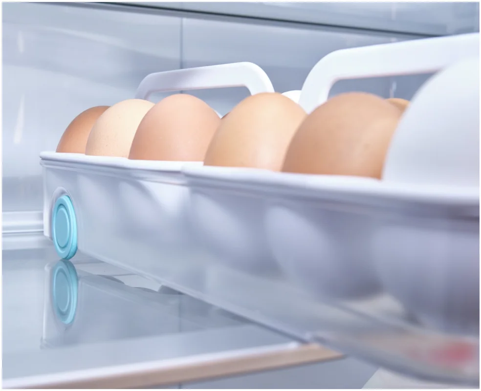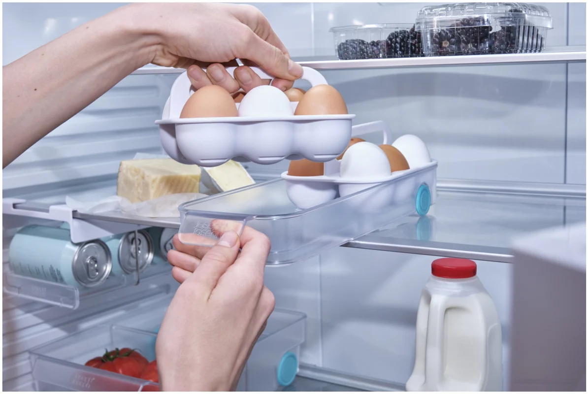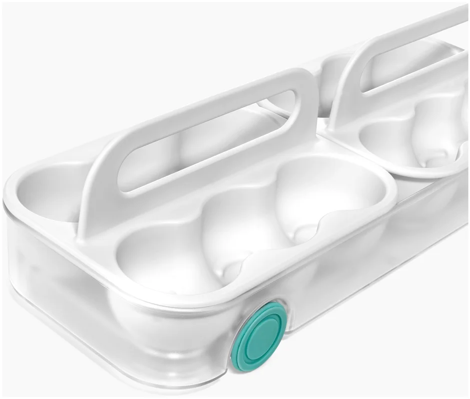 Kartoneierschachteln können feucht werden und zerfallen. Dieses Design bietet eine bessere Lösung: Zwei Tabletts fassen je sechs Eier, bleiben übersichtlich und sitzen in einem leichtgängigen Schlitten mit Frontgriff. Mit Tragegriffen für den Transport zur Kochstelle.