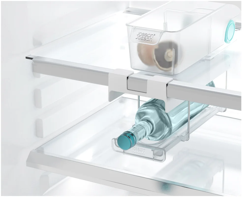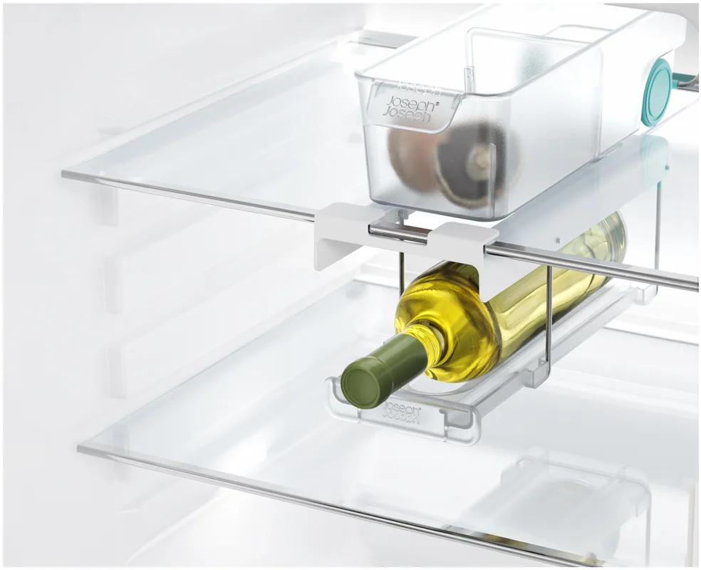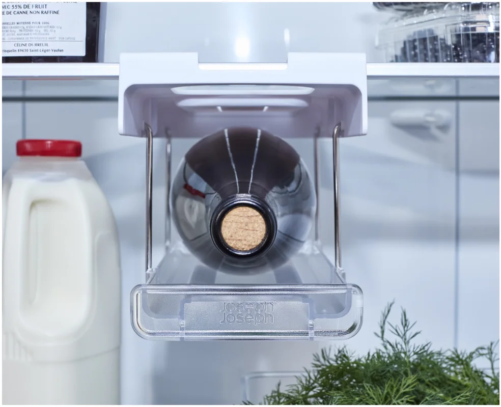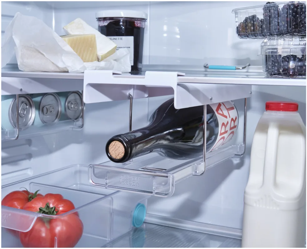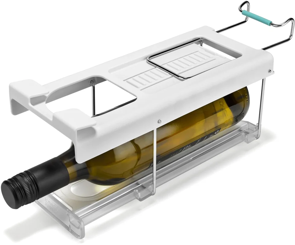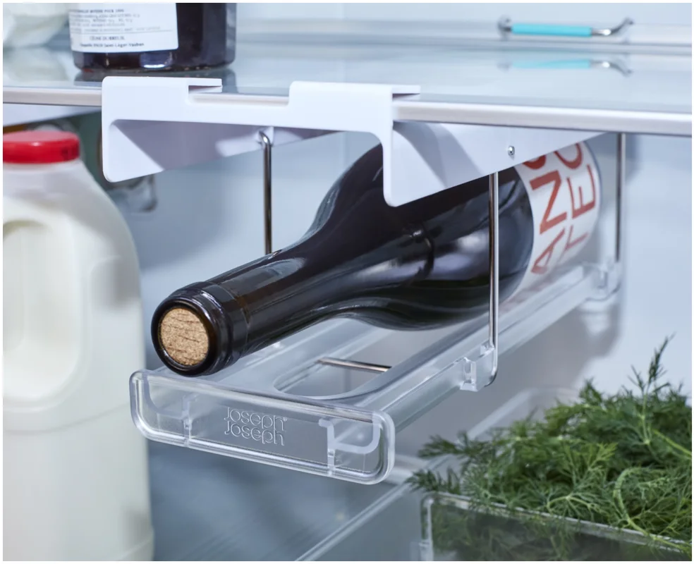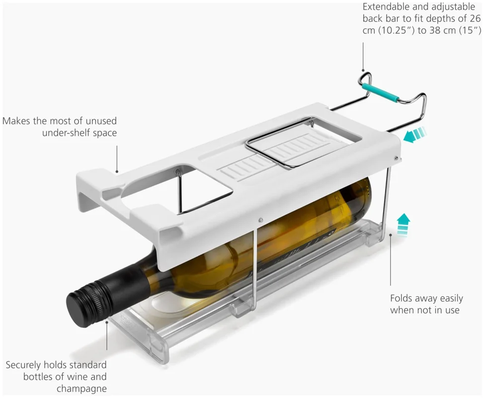 Flaschen im Kühlschrank zu lagern kann schwierig sein. Dieser innovative Halter wird unter dem Regal eingehängt und schafft stabilen, leicht zugänglichen Stauraum passend für gängige Wein- und Champagnerflaschen. Er lässt sich vorne und hinten einklipsen und bei Nichtgebrauch flach nach oben klappen.