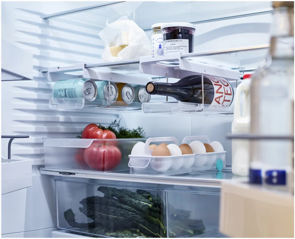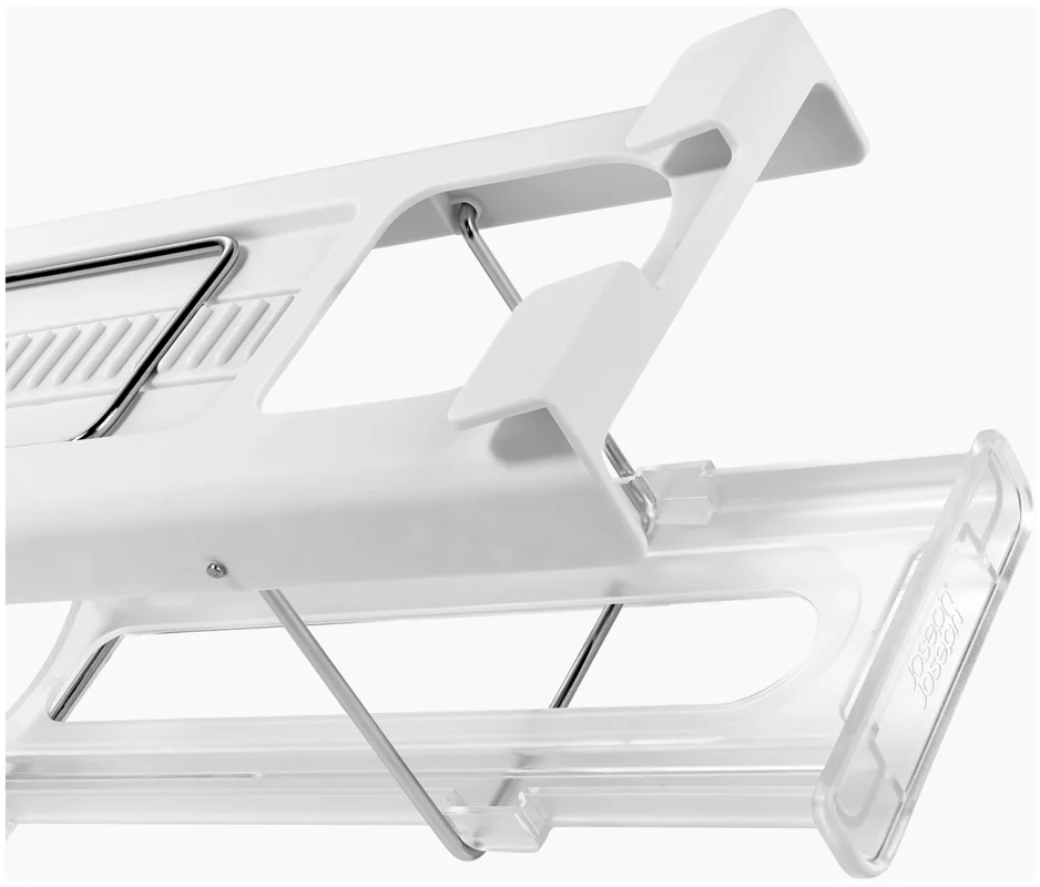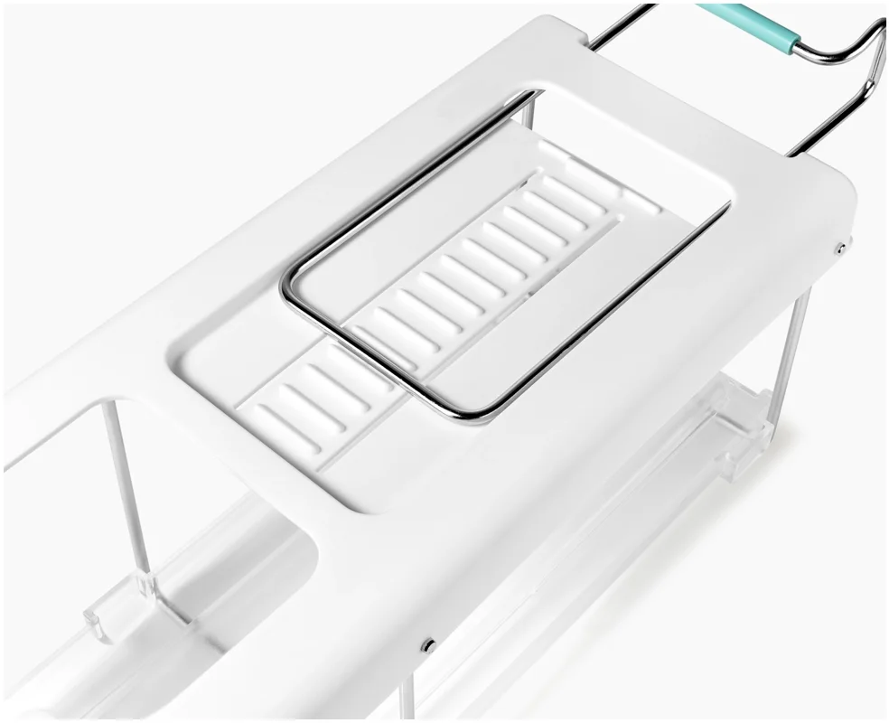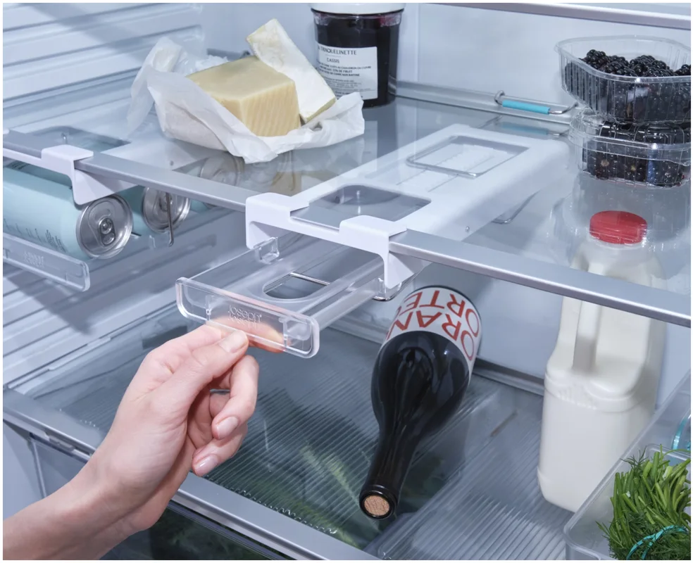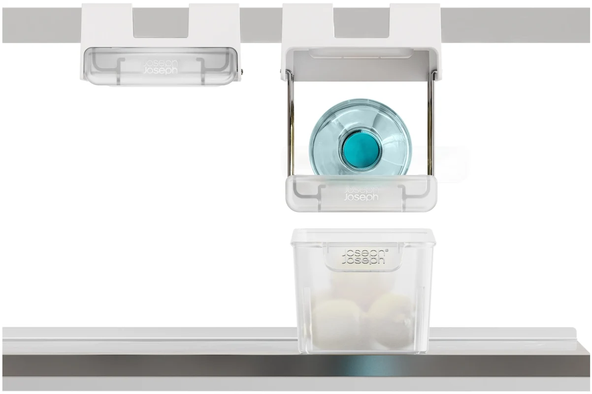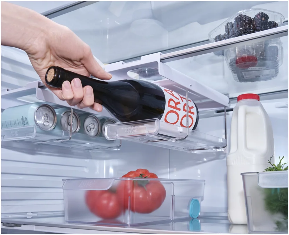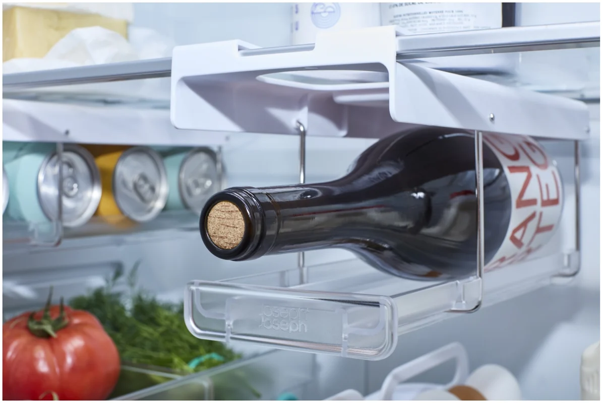 Flaschen im Kühlschrank zu lagern kann schwierig sein. Dieser innovative Halter wird unter dem Regal eingehängt und schafft stabilen, leicht zugänglichen Stauraum passend für gängige Wein- und Champagnerflaschen. Er lässt sich vorne und hinten einklipsen und bei Nichtgebrauch flach nach oben klappen.