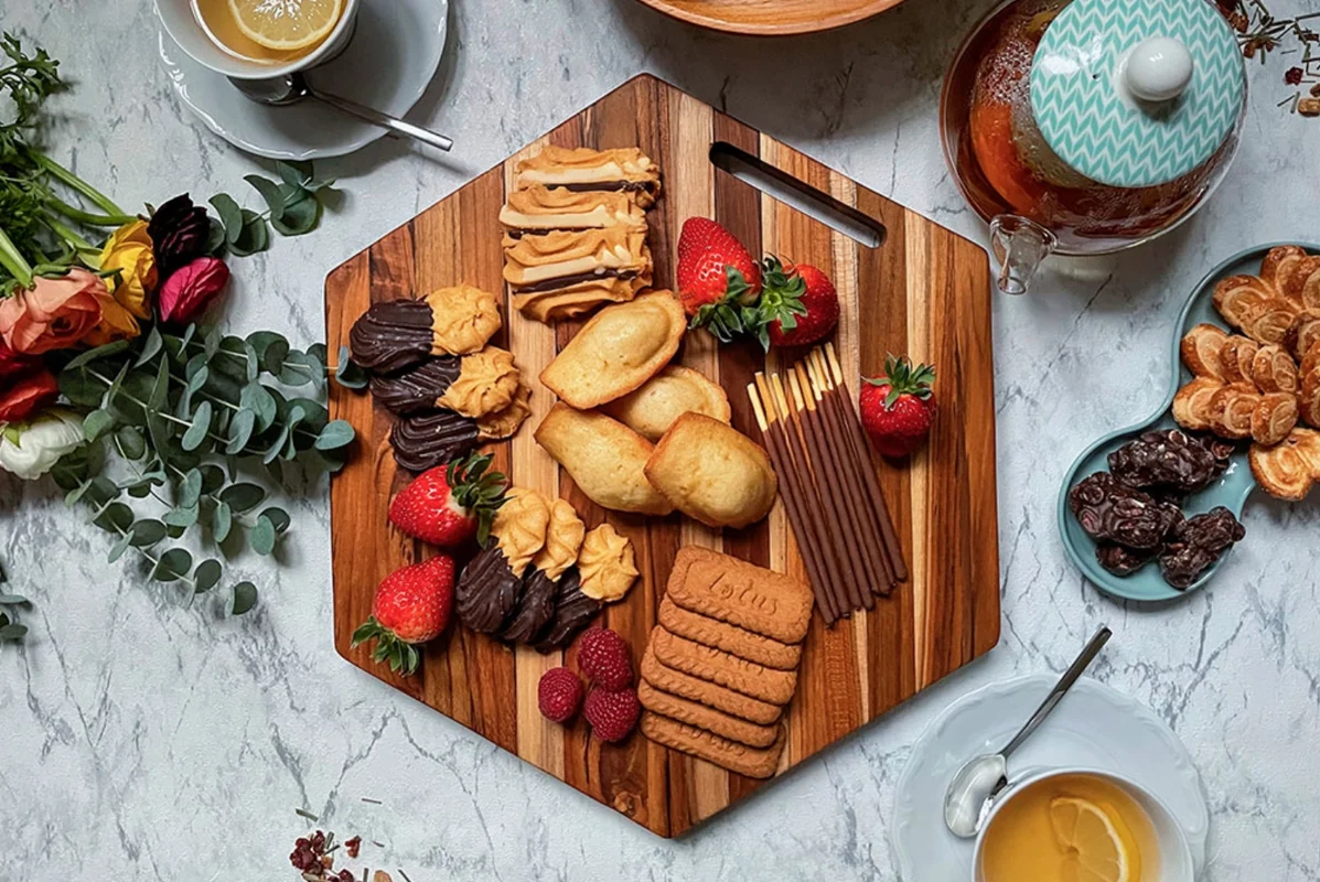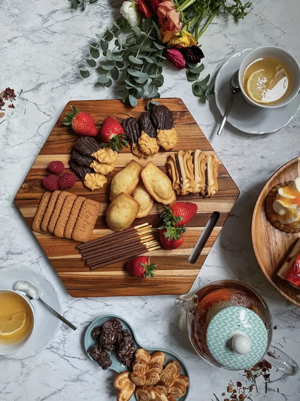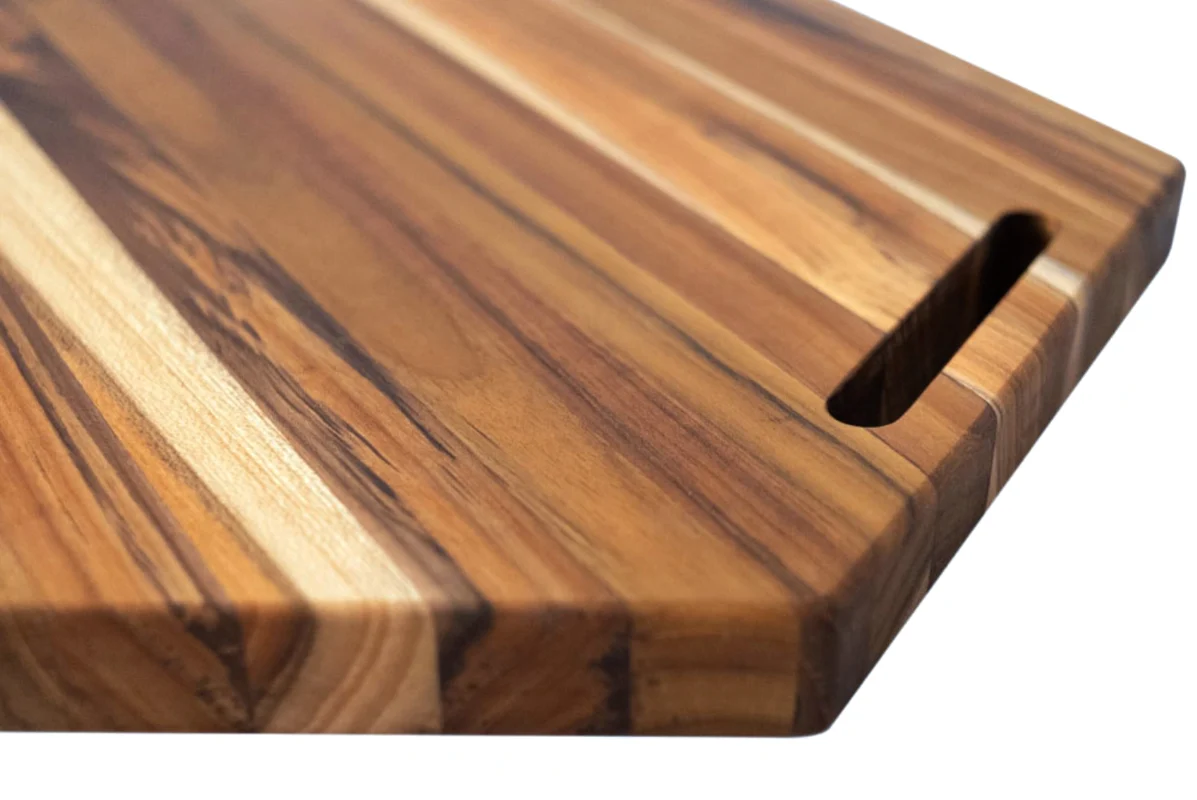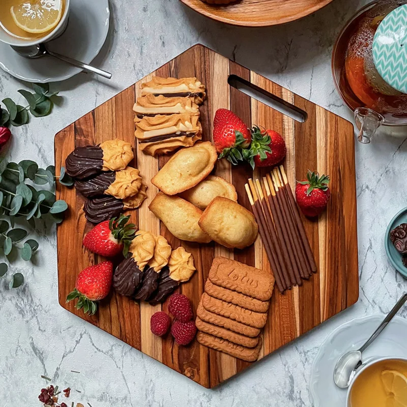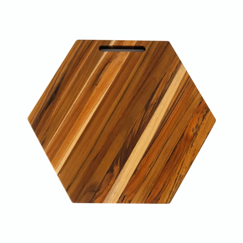 Unterhalten Sie stilvoll mit unserem Servierbrett aus Teakholz. Diese sechseckige Platte eignet sich perfekt für Snacks und Vorspeisen und dient gleichzeitig als Schneidebrett für alle Ihre Bedürfnisse als Gastgeber. Aus langlebigem und nachhaltigem Teakholz gefertigt, ist es eine vielseitige Ergänzung für jede Küche.