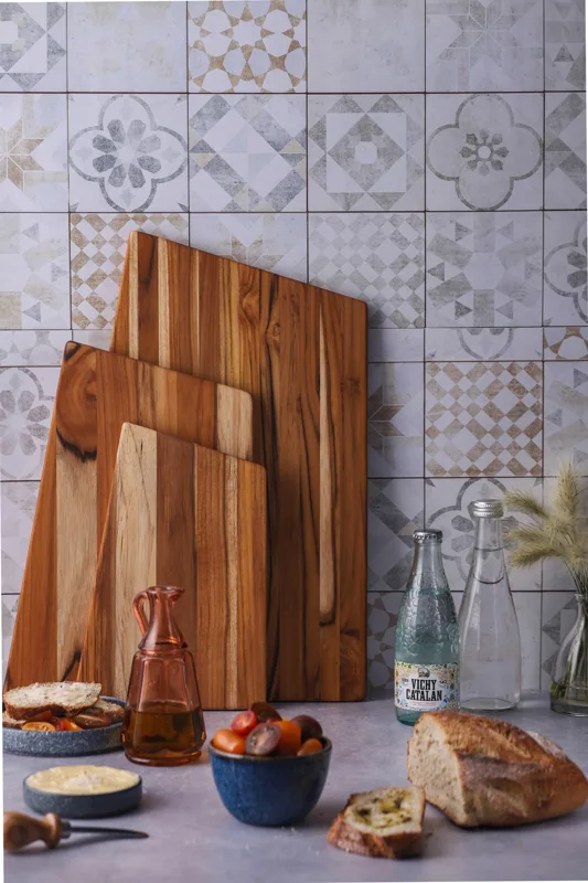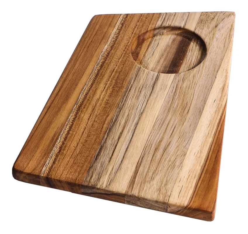 Dieses Servierbrett aus Teakholz hat ein elegantes Geo-Design und ein vielseitiges rundes Loch für Schalen oder Weinbecher. Es eignet sich perfekt zum Servieren von Snacks und Vorspeisen und ist somit ein Muss für jede Veranstaltung oder Party. Beeindrucken Sie Ihre Gäste mit diesem stilvollen und funktionalen Servierbrett aus Teakholz!