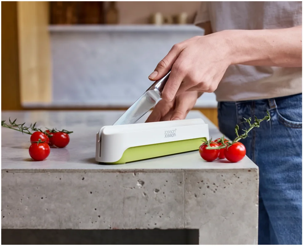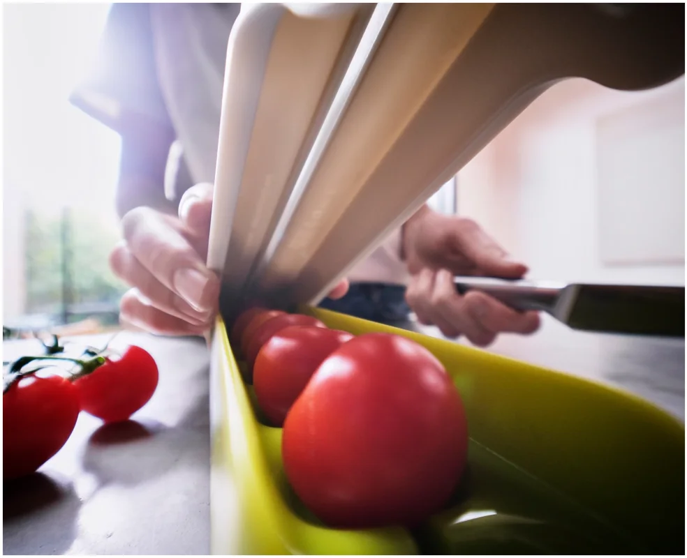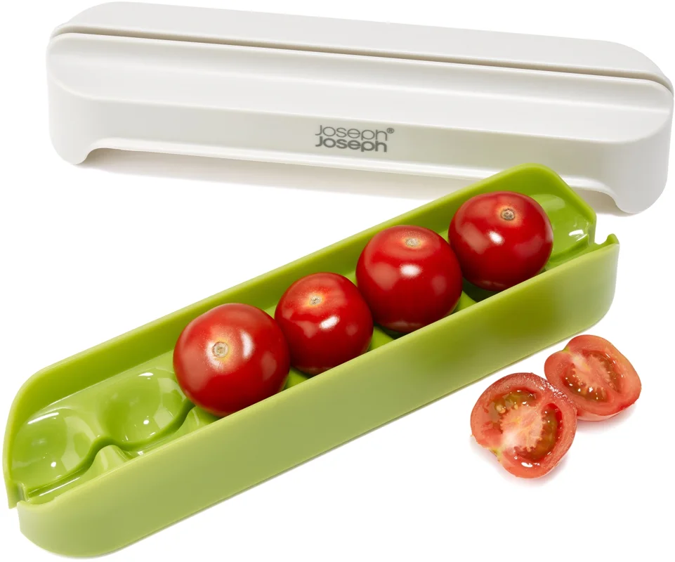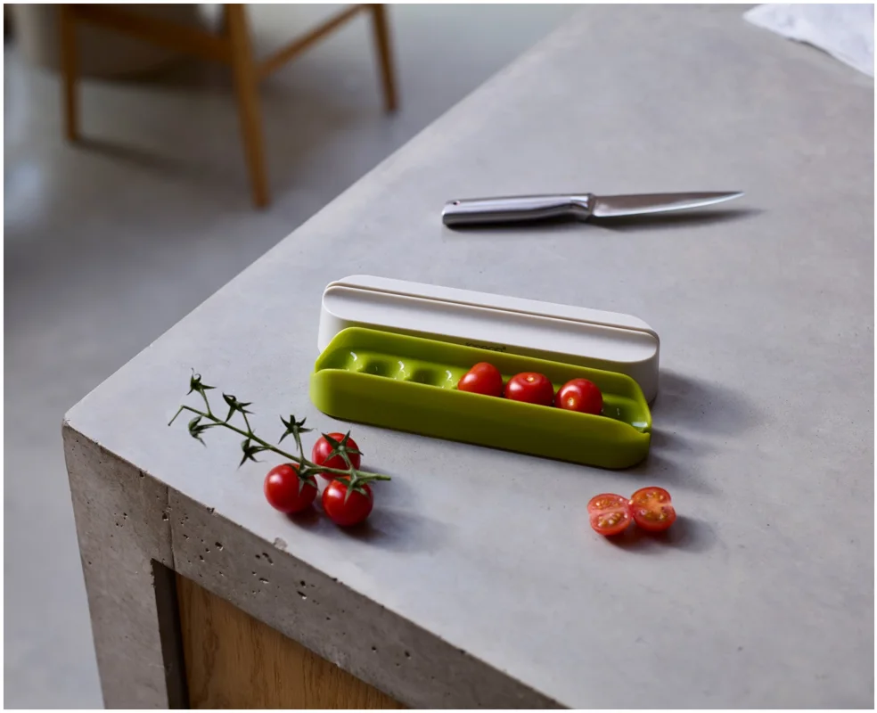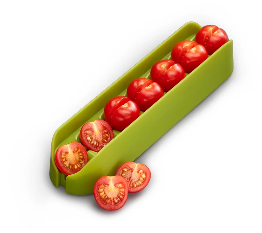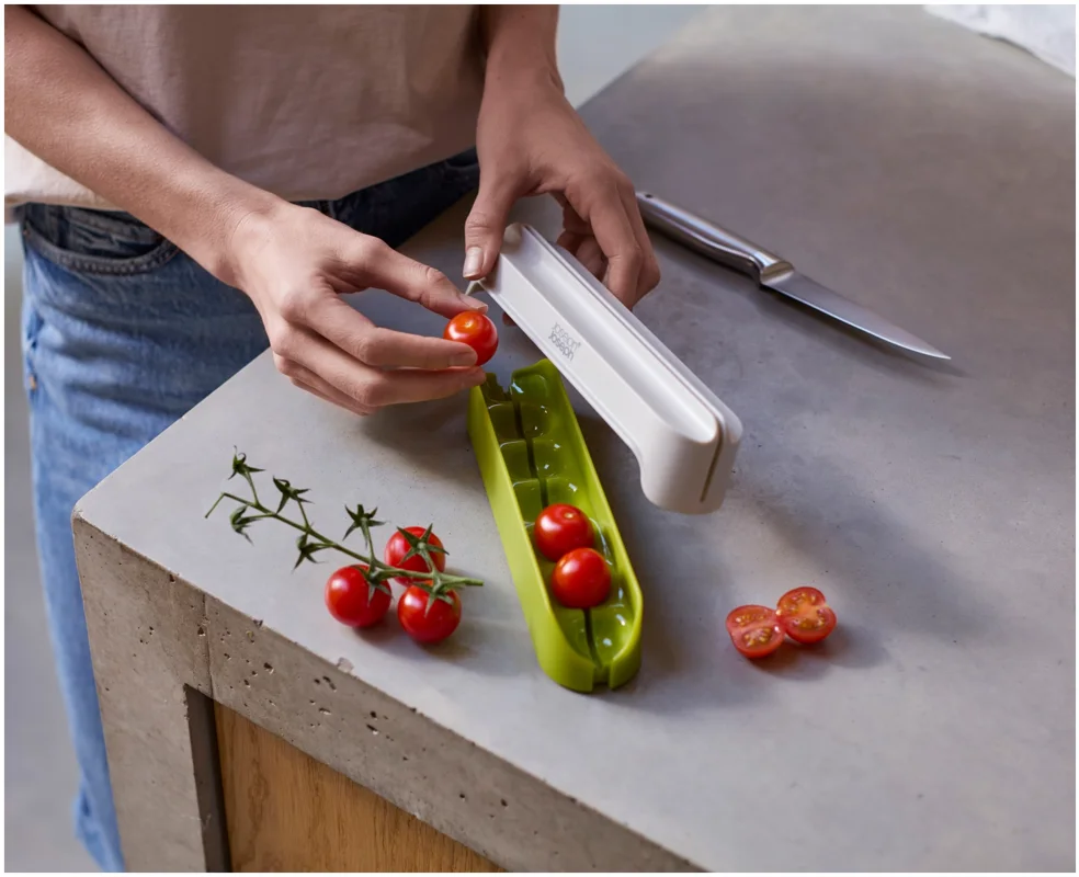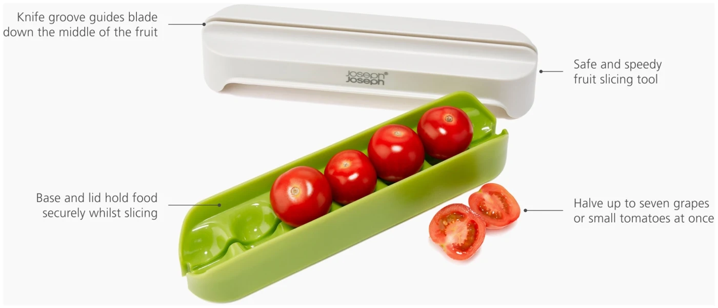 Das Schneiden kleiner Lebensmittel wie Trauben oder Cherrytomaten kann mit einem Messer zeitaufwändig sein. Dieses praktische Werkzeug macht es einfacher: Einfach bis zu sieben Stück in die Basis legen, den Deckel aufsetzen und ein Messer entlang der Führung führen so entstehen schnell gleichmässige Hälften. Ausserdem lässt es sich nach jeder Nutzung leicht abspülen und reinigen.