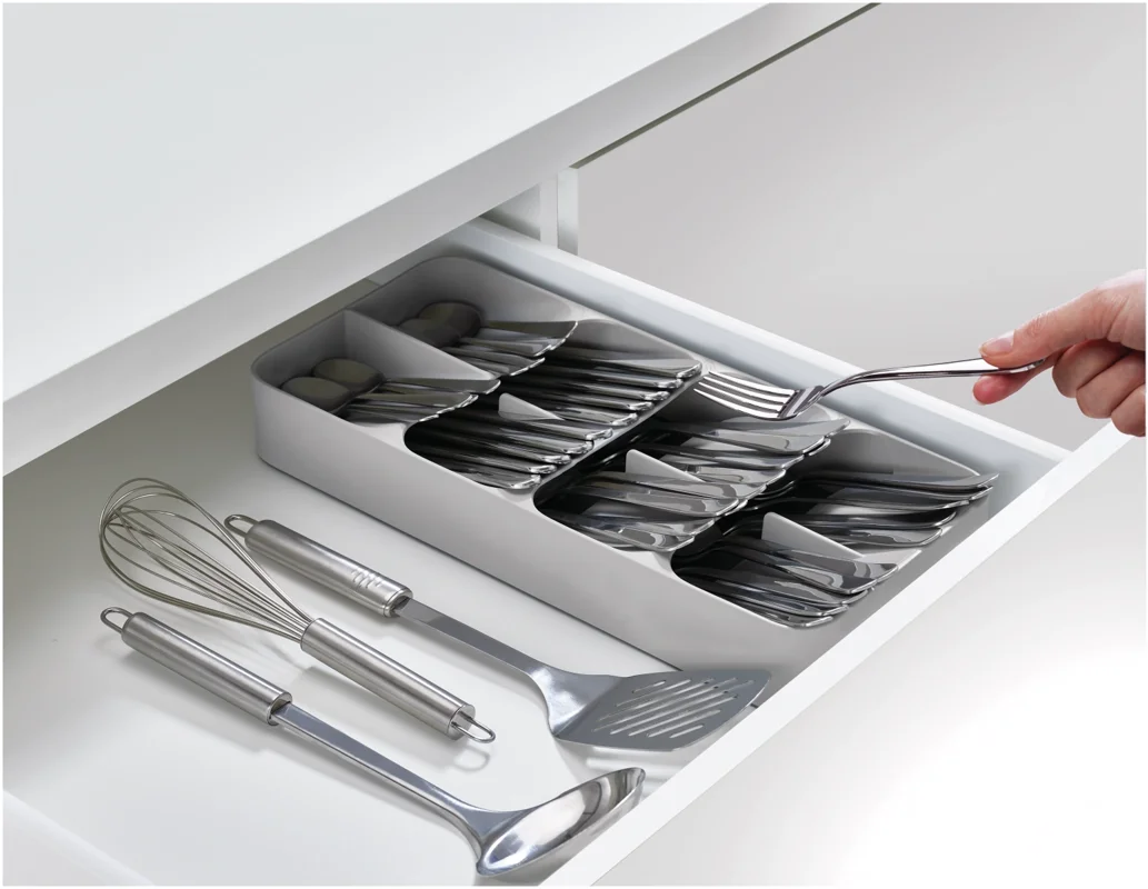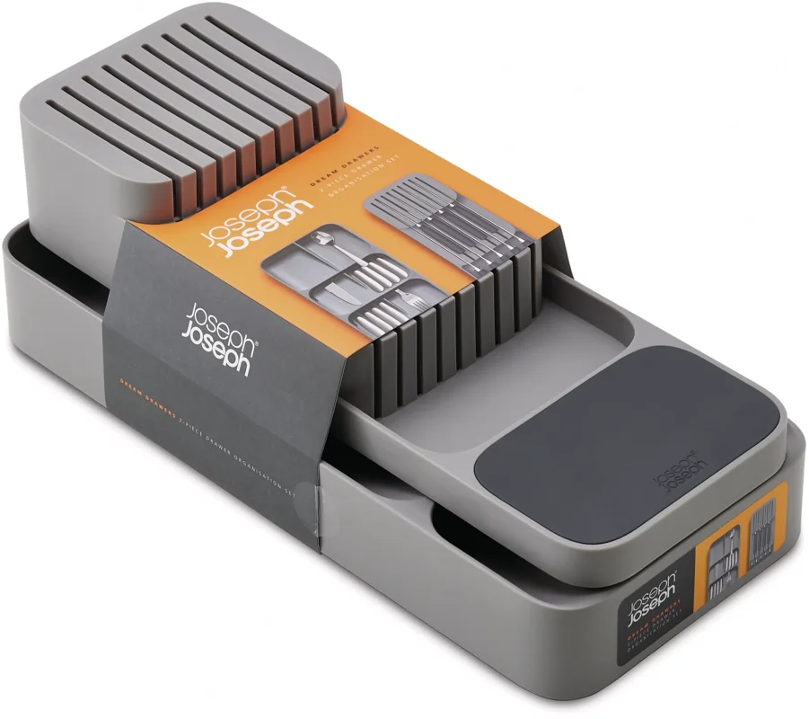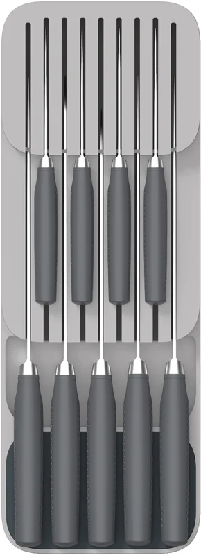 Bringen Sie Ordnung in Ihre Küchenschubladen mit diesem innovativen 2-teiligen Set. Der Besteckkasten verfügt über abgewinkelte Fächer, die sich übereinander schichten, so dass mehr als 48 Besteckteile auf kleinstem Raum untergebracht werden können. Die Teile können entweder mit dem Kopf oder mit dem Griff nach innen gelegt werden, und das Design ist mit praktischen Symbolen zur einfachen Identifizierung und rutschfesten Füßen ausgestattet. Der 2-stufige Messer-Organizer bietet eine sichere Aufbewahrung und einen einfachen Zugang für eine Reihe von Küchenmessern. Er verfügt über zwei Ebenen für unterschiedliche Klingenlängen und bietet Platz für bis zu neun Messer in einem übersichtlichen, kompakten Raum. Rutschfeste Füße an der Basis verhindern, dass das Gerät in der Schublade herumrutscht. Geeignet für Messerklingen bis zu 9 Zoll (23 cm). Beide Artikel sind fÃ?r Schubladen mit einer Mindesthöhe von 8 cm (3¼ Zoll) geeignet.