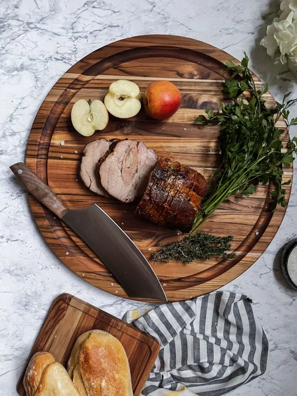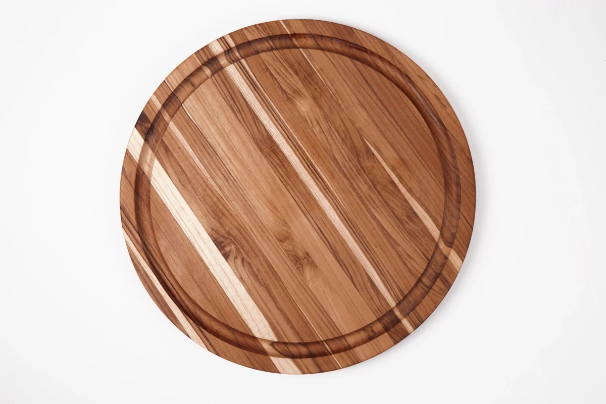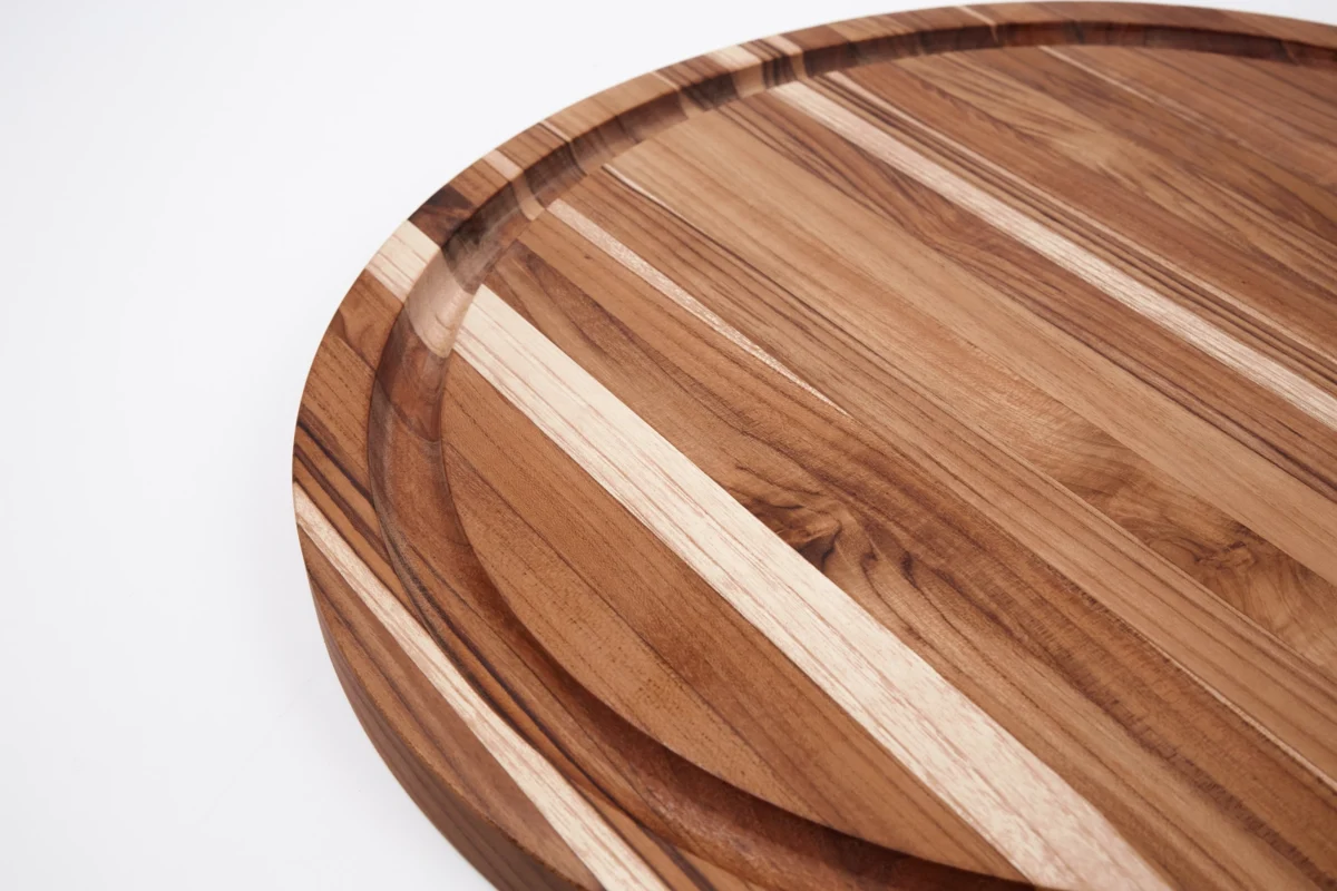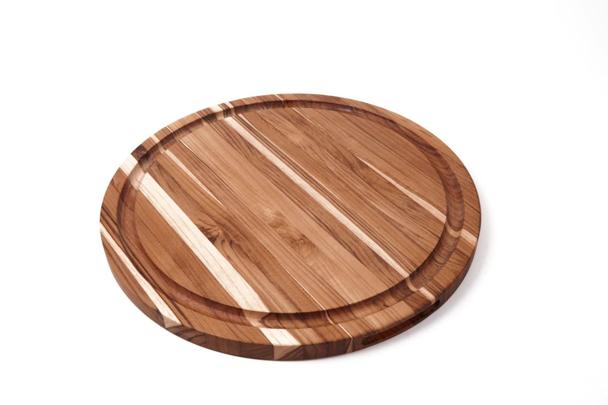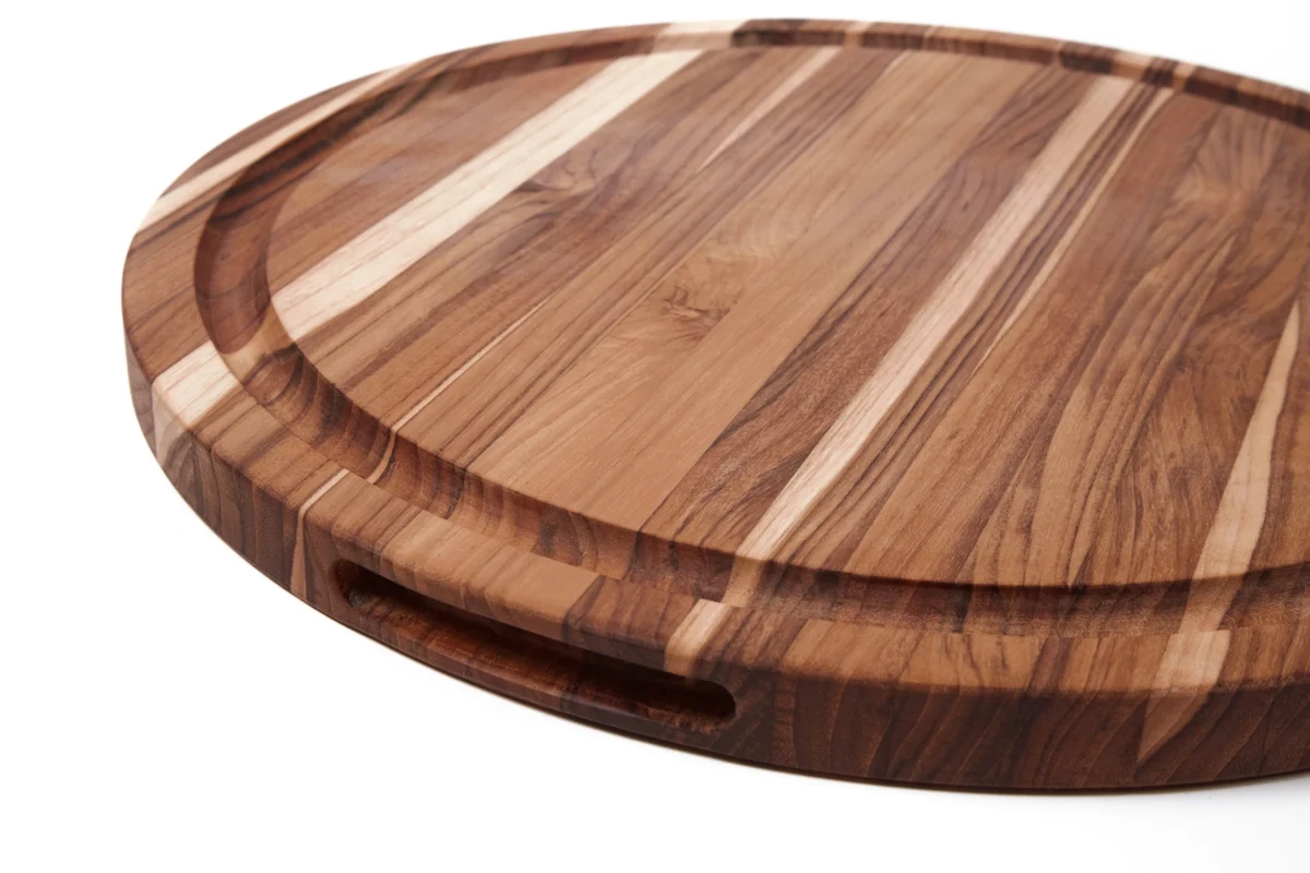 Dieses vielseitige Servierbrett aus Teakholz eignet sich perfekt für jede Gelegenheit, von der Zubereitung von Snacks und Vorspeisen bis zum stilvollen Servieren derselben. Sein nachhaltiges Design mit FSC-Zertifizierung ist nicht nur umweltfreundlich, sondern auch antibakteriell. Das runde Tablett mit Tropfkante und praktischen Griffen ist die ideale Ergänzung für jeden gedeckten Tisch und jeden Grill im Freien.