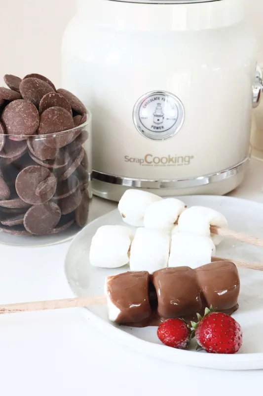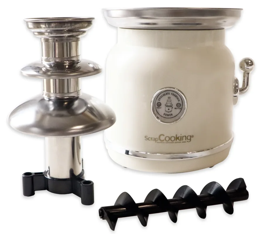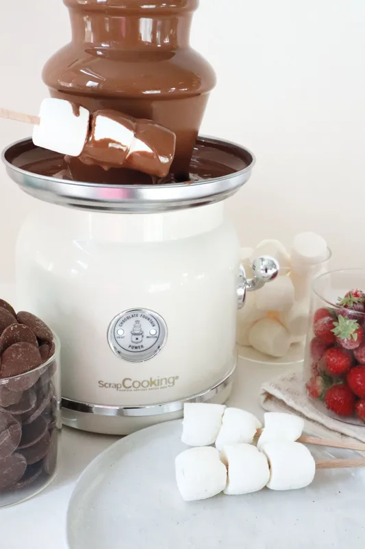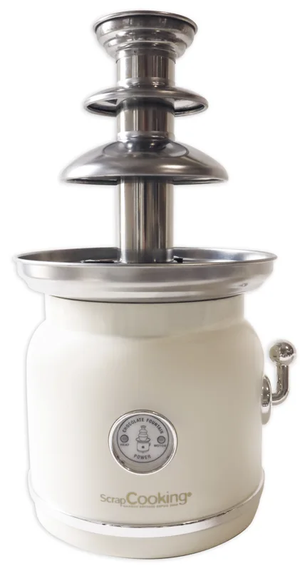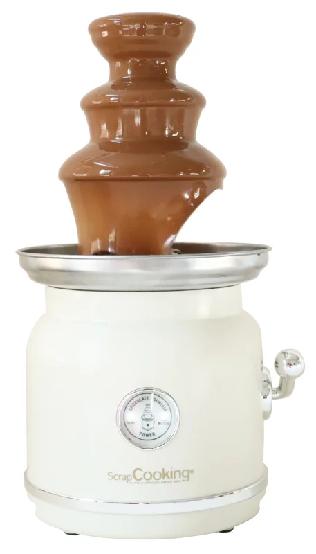 3 Kaskadenstufen Schmelzen Sie die Schokolade Ihrer Wahl in der Mikrowelle oder im Wasserbad, gießen Sie sie in den Behälter, schalten Sie die Fontäne ein und der Zauber beginnt! Die köstliche Schokolade fließt heraus und Sie müssen sie nur noch nach Belieben genießen! Kuchen, Obst, Süßigkeiten ... Lassen Sie Ihren Wünschen freien Lauf! Die perfekte Art, Gourmetmomente mit Familie und Freunden zu verbringen!