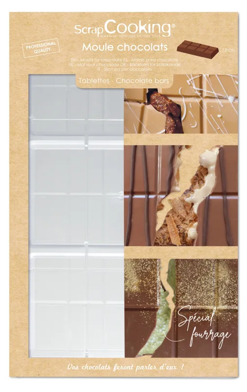 Mit diesem praktischen Format kannst du normale, aromatisierte oder farbige Schokoladentafeln machen! Dank der Tiefe kannst du deiner Fantasie freien Lauf lassen und gefüllte Tafeln mit Pralinen, Pistazien, Haselnusspaste und vielem mehr kreieren.