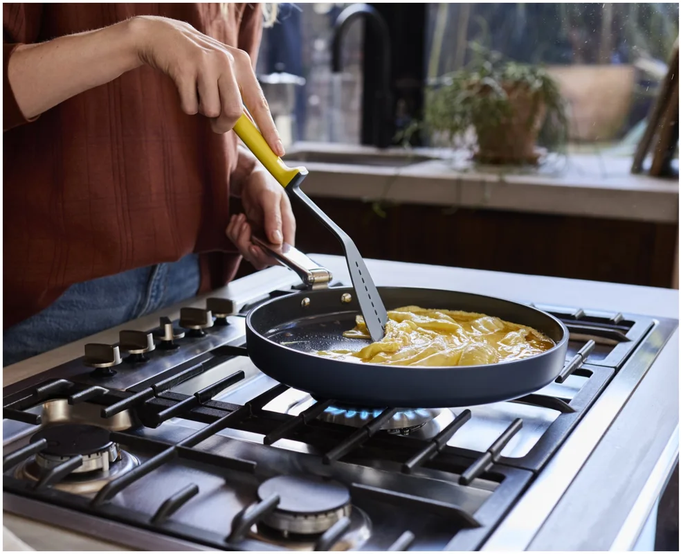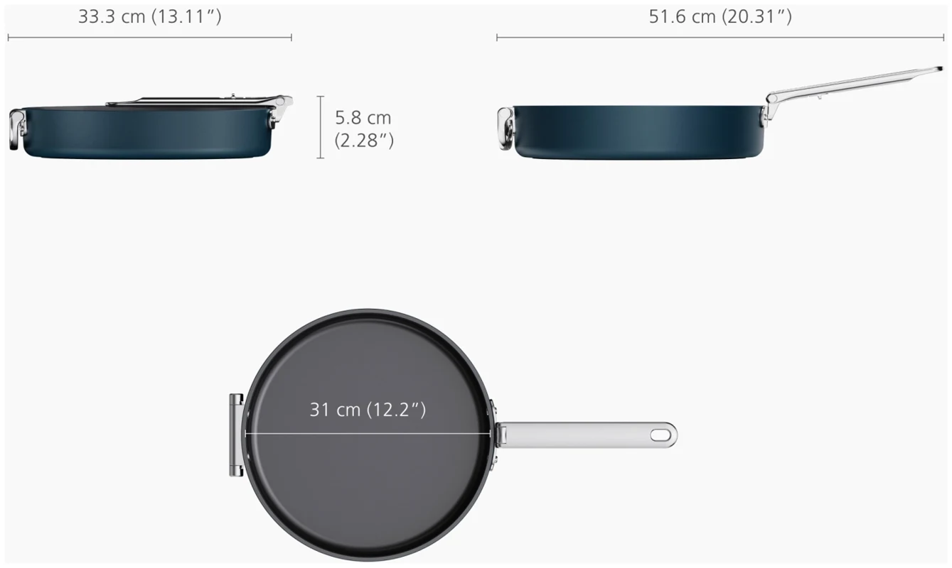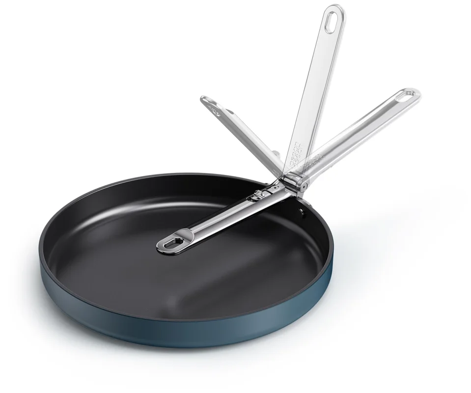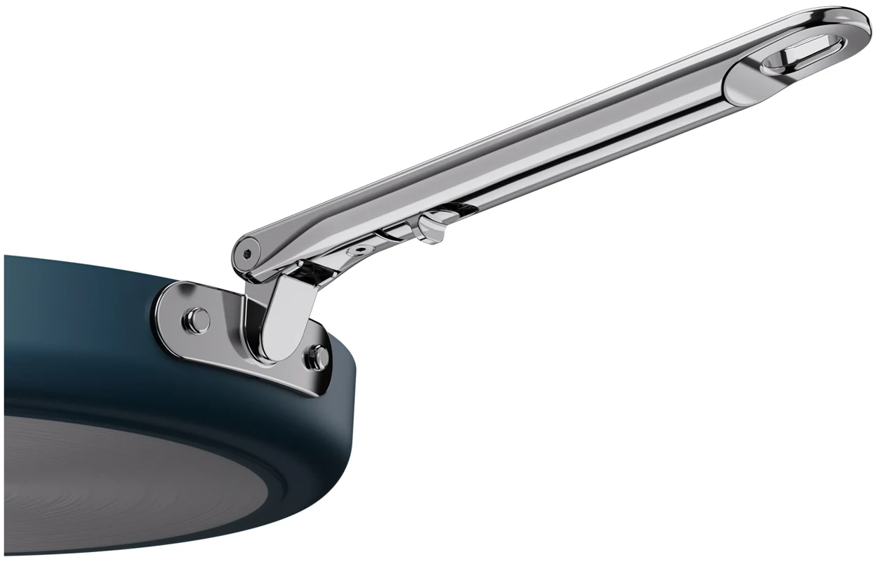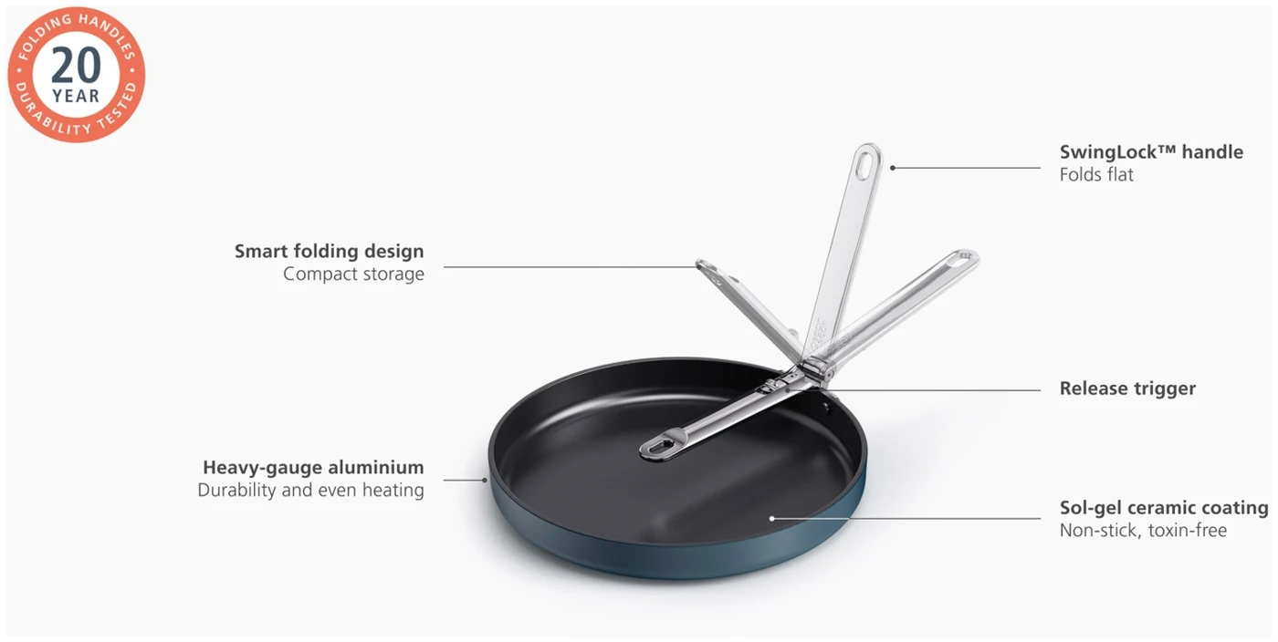 Sag Tschüss zu Unordnung und Hallo zu Platz mit dieser flachen 30-cm-Bratpfanne (12") mit Antihaftbeschichtung. Sie verfügt über einen Edelstahlgriff mit unserem patentierten SwingLock-Mechanismus, der während des Gebrauchs sicher einrastet und sich für eine kompakte Aufbewahrung zusammenklappen lässt. Das spart beim Verstauen bis zu 50 % Platz im Vergleich zu Standardpfannen. Der robuste, dickwandige Aluminiumkorpus sorgt für gleichmässige Wärmeverteilung und ist mit einer leistungsstarken keramischen Antihaftbeschichtung ausgestattet, die frei von PTFE, PFAS, PFOA, Blei und Cadmium ist. Geeignet für alle Herdarten, inklusive Induktion, und ofenfest bis 232 °C (450 °F), Gasstufe 8. Teil der Space-Kochgeschirrserie entwickelt für Köche, gemacht für platzsparende Aufbewahrung.