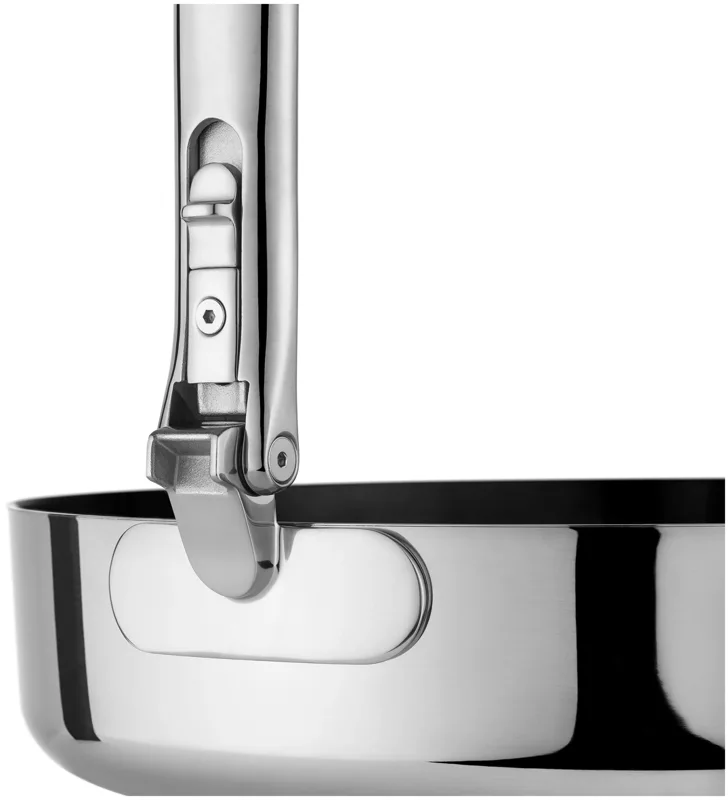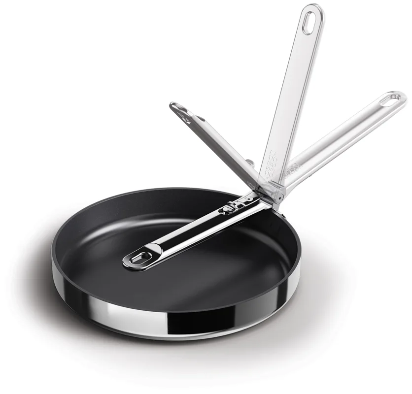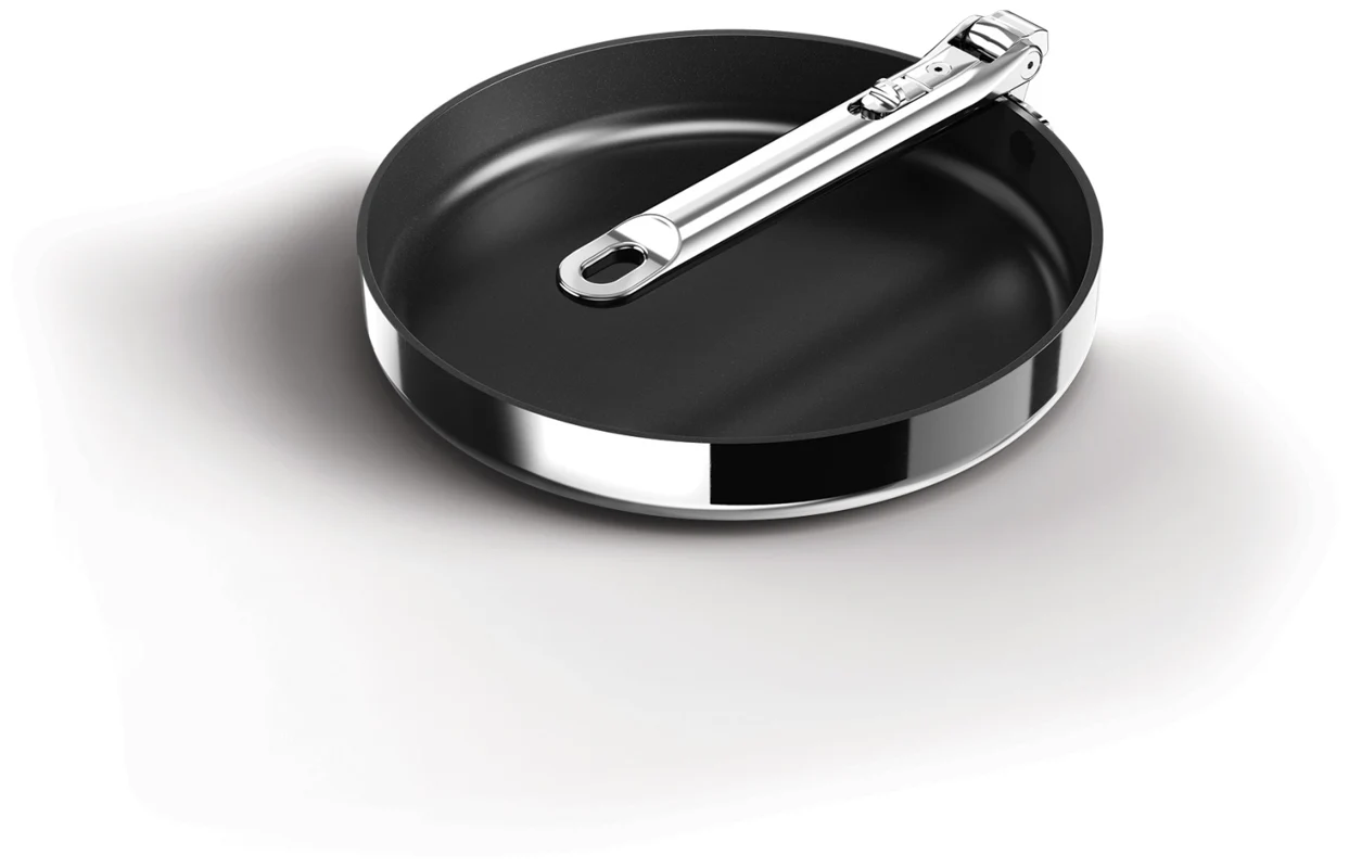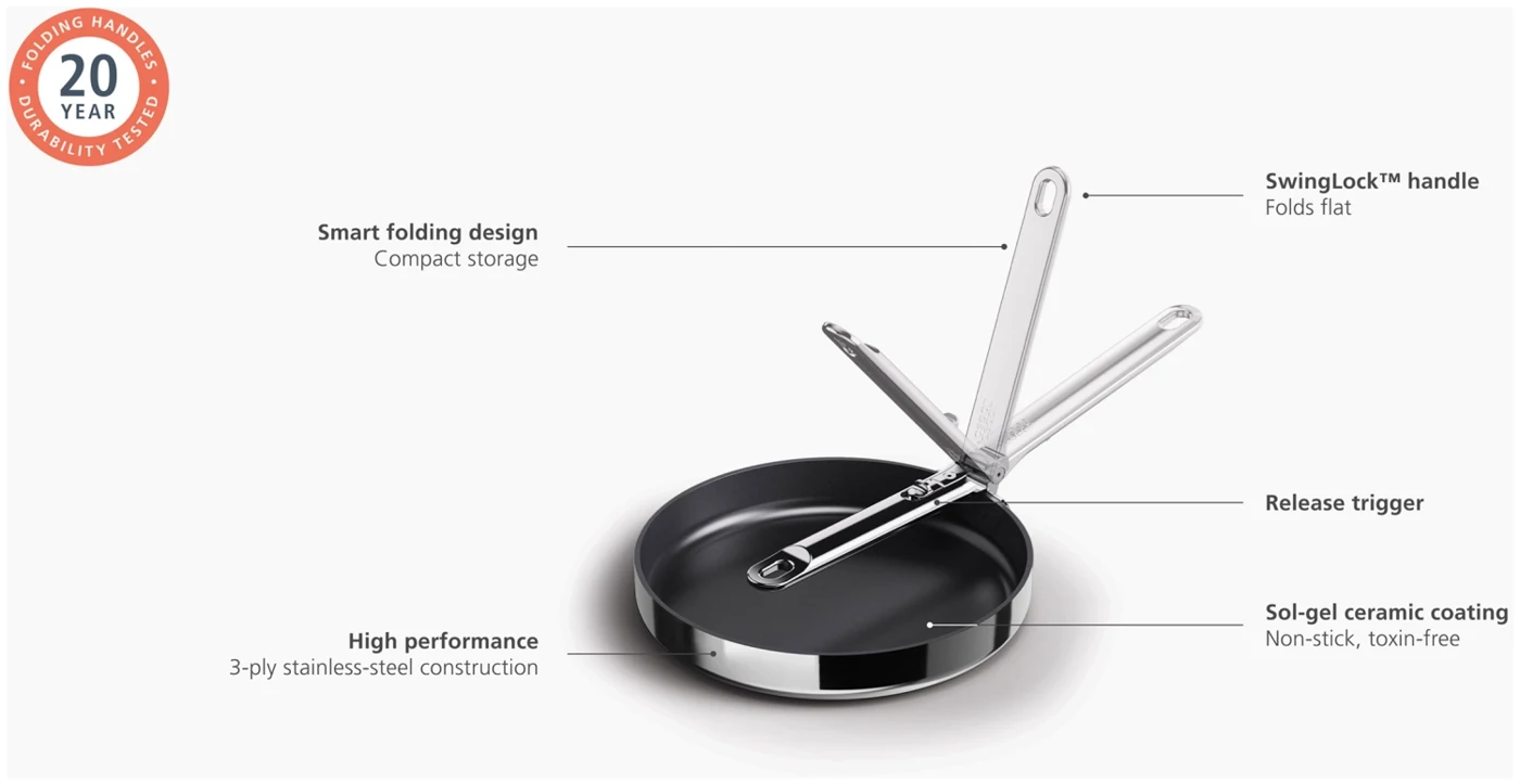 Goodbye clutter, hello Space! Diese 24-cm-Bratpfanne (9,5) mit Antihaftbeschichtung hat einen cleveren, klappbaren Edelstahlgriff, der beim Verstauen bis zu 50 % mehr Platz spart als eine Standardpfanne. Der Griff ist auf Langlebigkeit ausgelegt und verfügt über unseren patentierten, ausfallsicheren SwingLock-Mechanismus, der ihn während des Gebrauchs sicher fixiert und im eingeklappten Zustand Platz spart. Auch bei der Kochleistung gibt es keine Kompromisse. Die Pfanne verfügt über eine hochwertige 3-Schicht-Konstruktion mit einem gleichmässig erhitzenden Aluminiumkern, eingebettet zwischen Edelstahlschichten, für optimale Wärmeverteilung. Zudem besitzt sie eine langlebige, ungiftige Keramikbeschichtung, die für eine Antihaftoberfläche sorgt und frei von PTFE, PFAS, PFOA, Blei und Cadmium ist. Geeignet für alle Herdarten, inklusive Induktion. Diese Pfanne ist Teil der Space-Kochgeschirrserie entwickelt für Köche, gemacht für platzsparende Aufbewahrung.