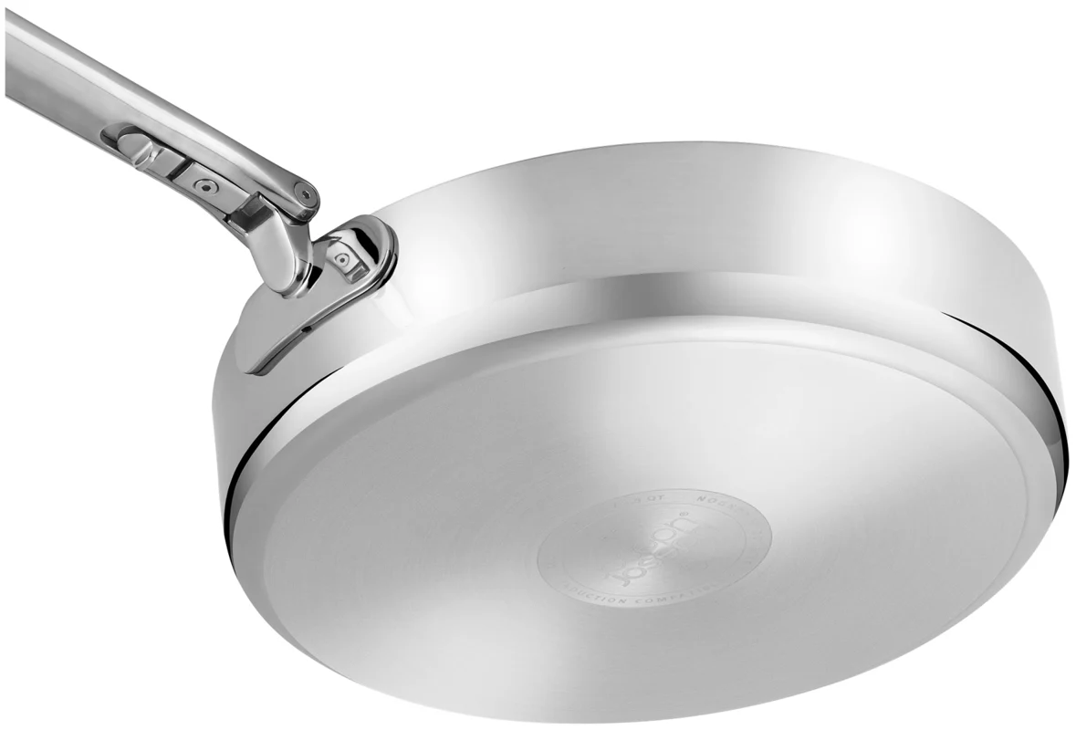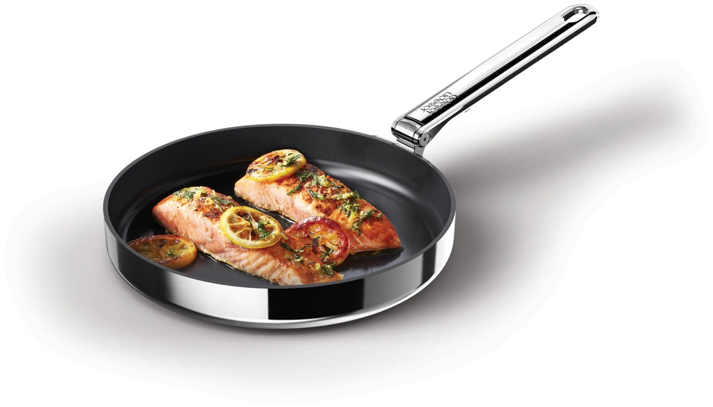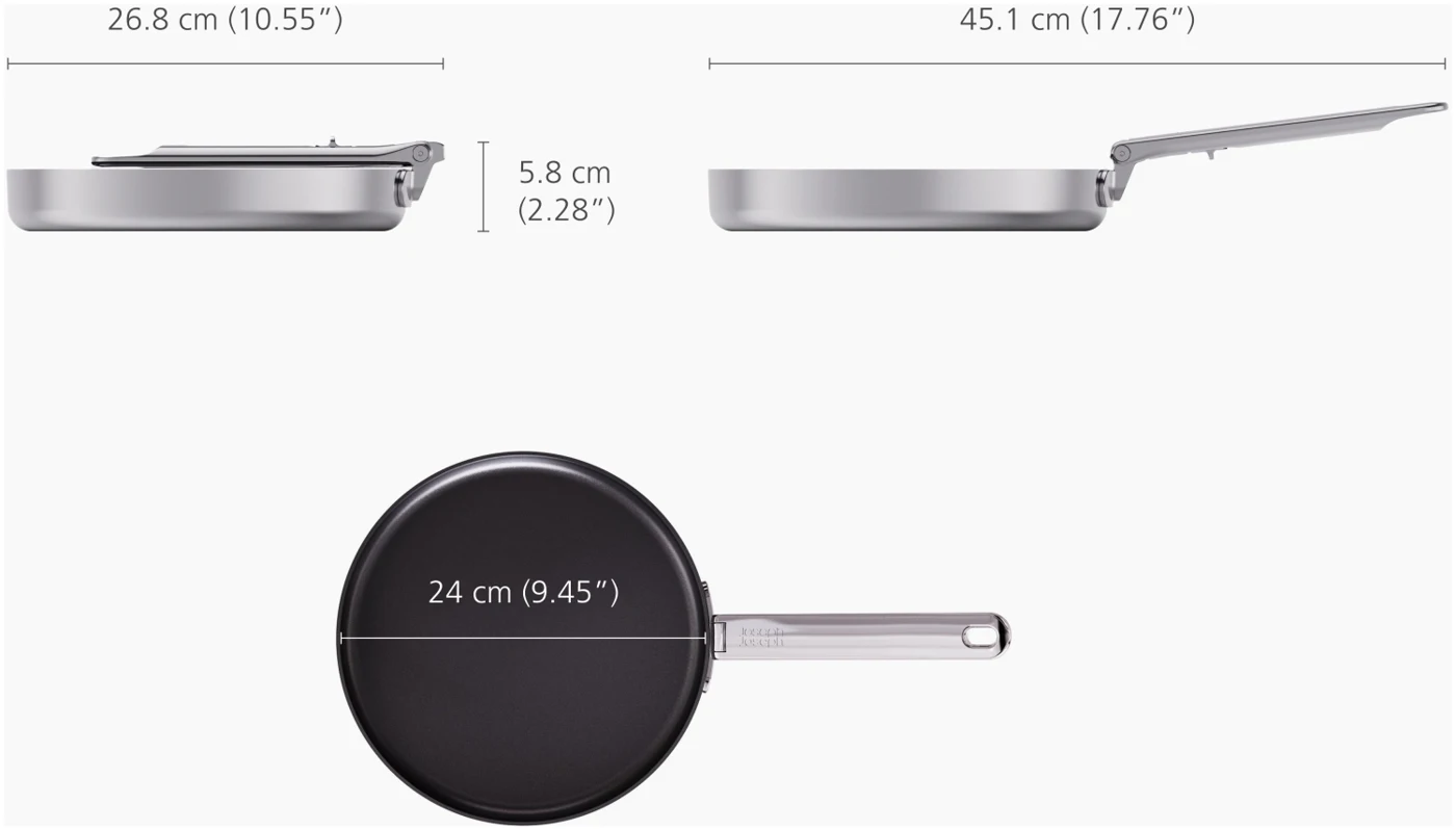 Goodbye clutter, hello Space! Diese 24-cm-Bratpfanne (9,5) mit Antihaftbeschichtung hat einen cleveren, klappbaren Edelstahlgriff, der beim Verstauen bis zu 50 % mehr Platz spart als eine Standardpfanne. Der Griff ist auf Langlebigkeit ausgelegt und verfügt über unseren patentierten, ausfallsicheren SwingLock-Mechanismus, der ihn während des Gebrauchs sicher fixiert und im eingeklappten Zustand Platz spart. Auch bei der Kochleistung gibt es keine Kompromisse. Die Pfanne verfügt über eine hochwertige 3-Schicht-Konstruktion mit einem gleichmässig erhitzenden Aluminiumkern, eingebettet zwischen Edelstahlschichten, für optimale Wärmeverteilung. Zudem besitzt sie eine langlebige, ungiftige Keramikbeschichtung, die für eine Antihaftoberfläche sorgt und frei von PTFE, PFAS, PFOA, Blei und Cadmium ist. Geeignet für alle Herdarten, inklusive Induktion. Diese Pfanne ist Teil der Space-Kochgeschirrserie entwickelt für Köche, gemacht für platzsparende Aufbewahrung.