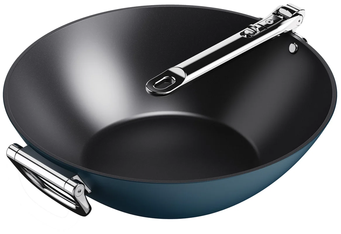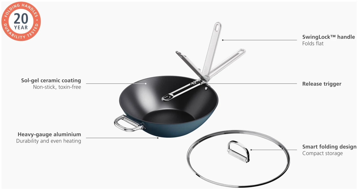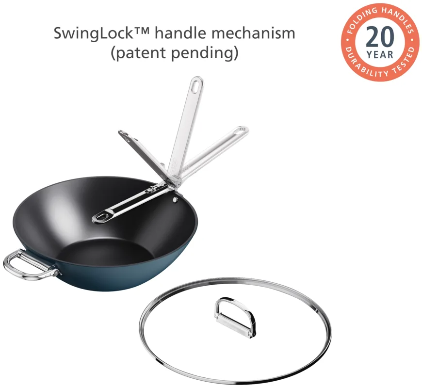 Goodbye clutter, hello Space! Dieser 32-cm-Wok (12,5") mit Antihaftbeschichtung und Deckel hat einen cleveren, klappbaren Edelstahlgriff, der beim Verstauen bis zu 50 % mehr Platz spart als ein Standard-Wok. Der Griff ist auf Langlebigkeit ausgelegt und verfügt über unseren patentierten, ausfallsicheren SwingLock-Mechanismus, der ihn während des Gebrauchs sicher fixiert und im eingeklappten Zustand optimal verstauen lässt. Gegenüber befindet sich ein praktischer, ebenfalls klappbarer Zusatzgriff, der dir beim Anheben und Tragen zusätzliche Unterstützung bietet. Auch bei der Kochleistung gehst du keine Kompromisse ein. Der professionelle, dickwandige Aluminiumkorpus sorgt für eine gleichmässige Wärmeverteilung ohne Hotspots und ist robust gebaut. Die leistungsstarke, keramische Antihaftbeschichtung ist besonders widerstandsfähig, leicht zu reinigen und ermöglicht hervorragende Kochergebnisse. Gleichzeitig kochst du gesünder, denn die Beschichtung ist frei von PTFE, PFAS, PFOA, Blei und Cadmium so kannst du deine Lieblingsrezepte mit gutem Gefühl zubereiten. Der Wok wird mit einem Deckel aus gehärtetem Glas geliefert, der ebenfalls einen klappbaren Griff besitzt und die Aufbewahrung noch einfacher macht. Geeignet für alle Herdarten, inklusive Induktion. Dieser Wok ist Teil der Space-Kochgeschirrserie entwickelt für Köche, gemacht für platzsparende Aufbewahrung.