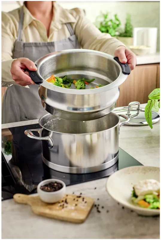 Der spezielle Silikondichtungsring verhindert Dampfverlust und ermöglicht das Stapeln mehrerer Dämpfeinsätze. Dank des cleveren Designs lässt sich der Einsatz mühelos aus dem Topf heben. Der Edelstahl mit Silvinox®-Technologie ist anlaufbeständig und leicht zu reinigen.
