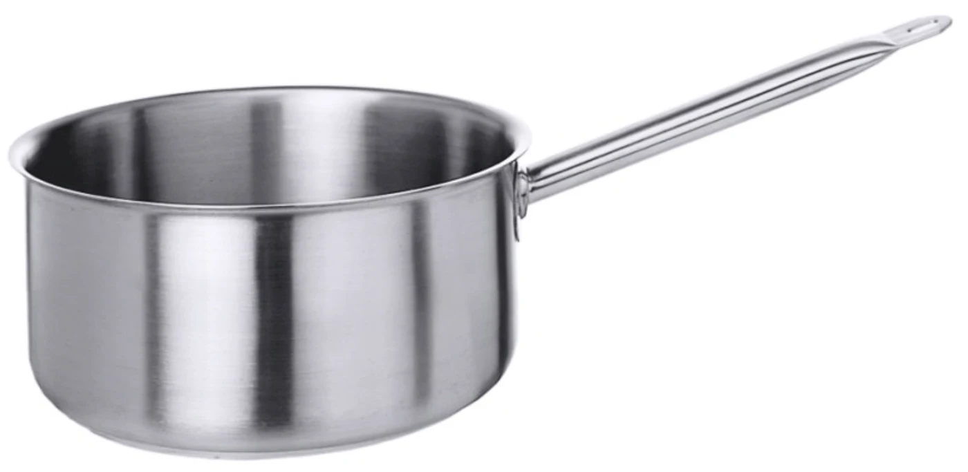 Stielkasserolle, niedrig, Sautoirform, aus Edelstahl 18/10, matt poliert, mit Rohrgriff und Schüttrand, 7 mm Sandwichboden, induktionsgeeignet, schwere Qualität