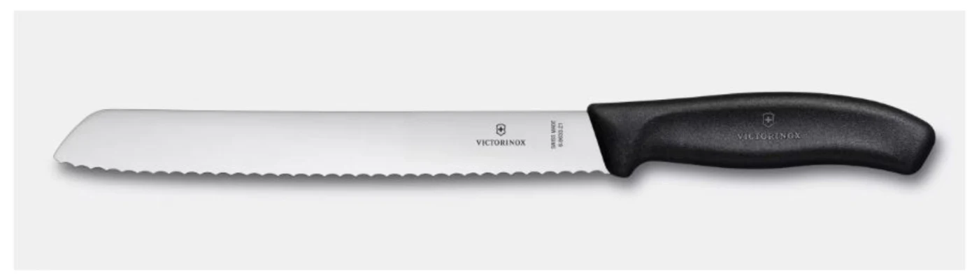 Dieses Brotmesser mit Wellenschliffklinge aus rostfreiem Stahl mit Profi-Schärfe schneidet mühelos durch alle Arten von Brot und Gebäck. Der ergonomische Griff liegt sicher und komfortabel in der Hand. In der Schweiz hergestellt und spülmaschinengeeignet für dauerhafte Leistung und pflegeleichte Reinigung.