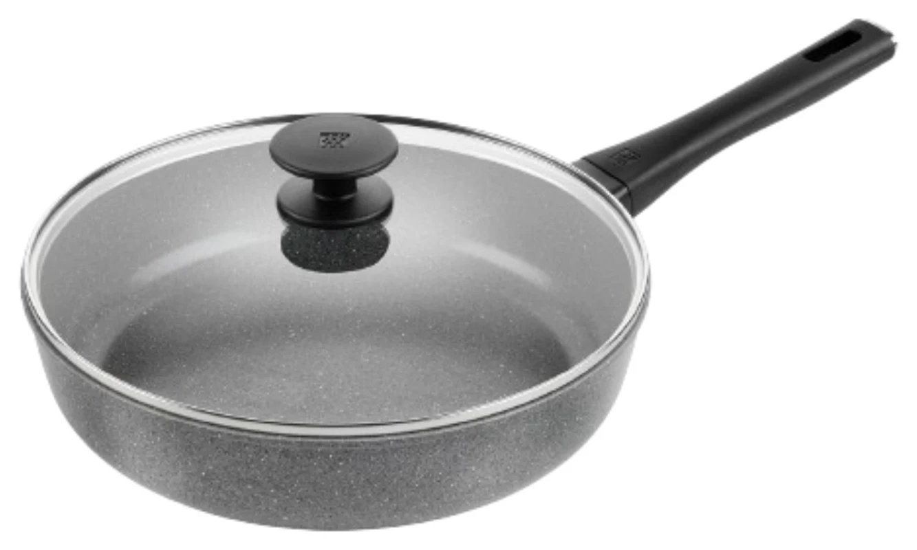Die ZWILLING Terreno Plus Schmorpfanne erfüllt höchste Ansprüche in der Küche. Hergestellt in Italien. Produziert ohne PFAS. Mit besonders robuster Titan-Hartgrundierung für ideale Antihaft-Eigenschaften. Bis zu fünfmal langlebiger als unsere bisherigen Keramikbeschichtungen*. Der massive Aluminiumkörper verteilt die Hitze schnell und gleichmäßig in der gesamten Pfanne. Und dank dem Glasdeckel bleiben Wärme und Feuchtigkeit in der Pfanne. Für delikate Ergebnisse und ein energieeffizientes Braten und Schmoren. Abgerundet wird die innovative Pfanne im Granitium-Look durch den Stay-Cool-Griff. Er behält immer eine angenehme Temperatur und liegt so sicher in der Hand.