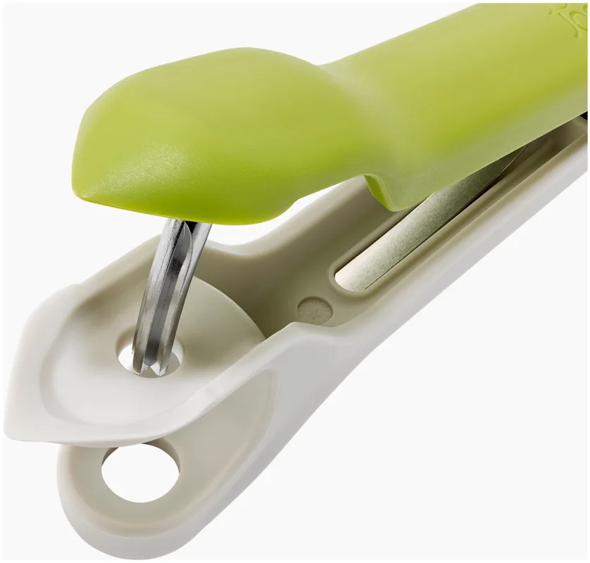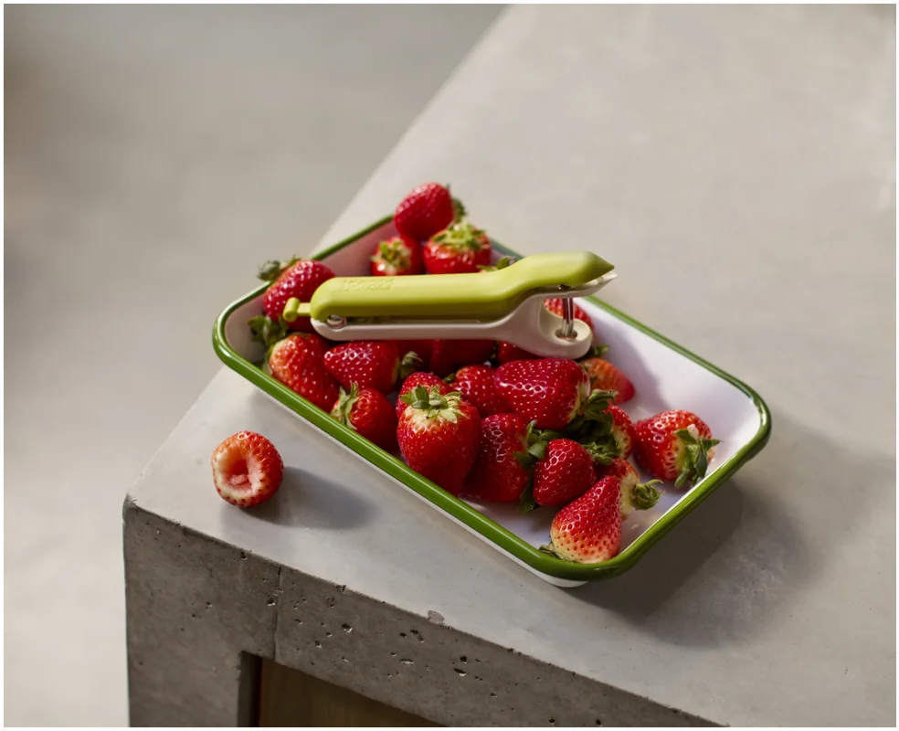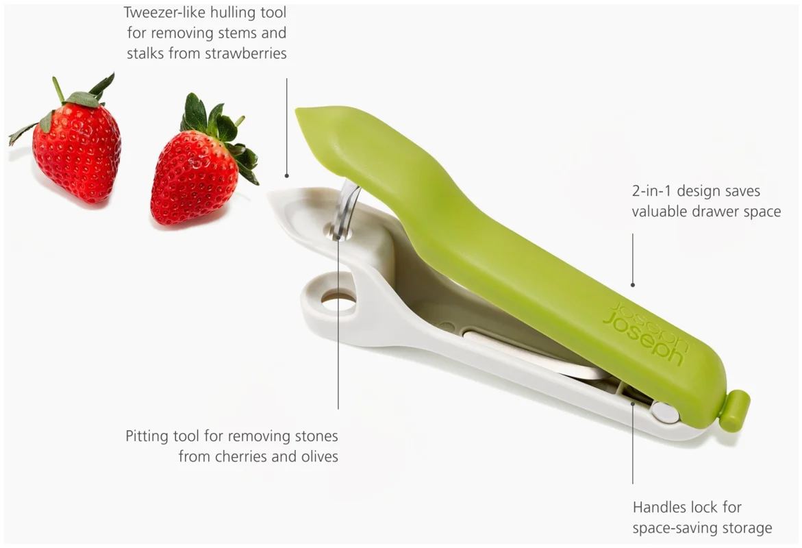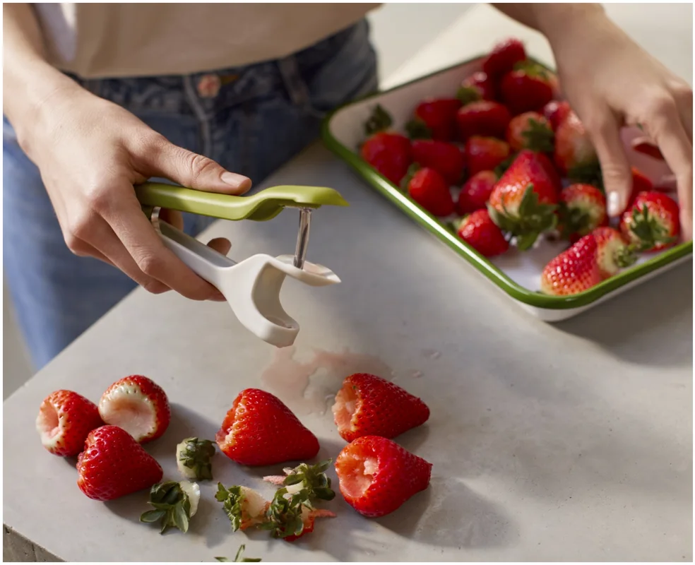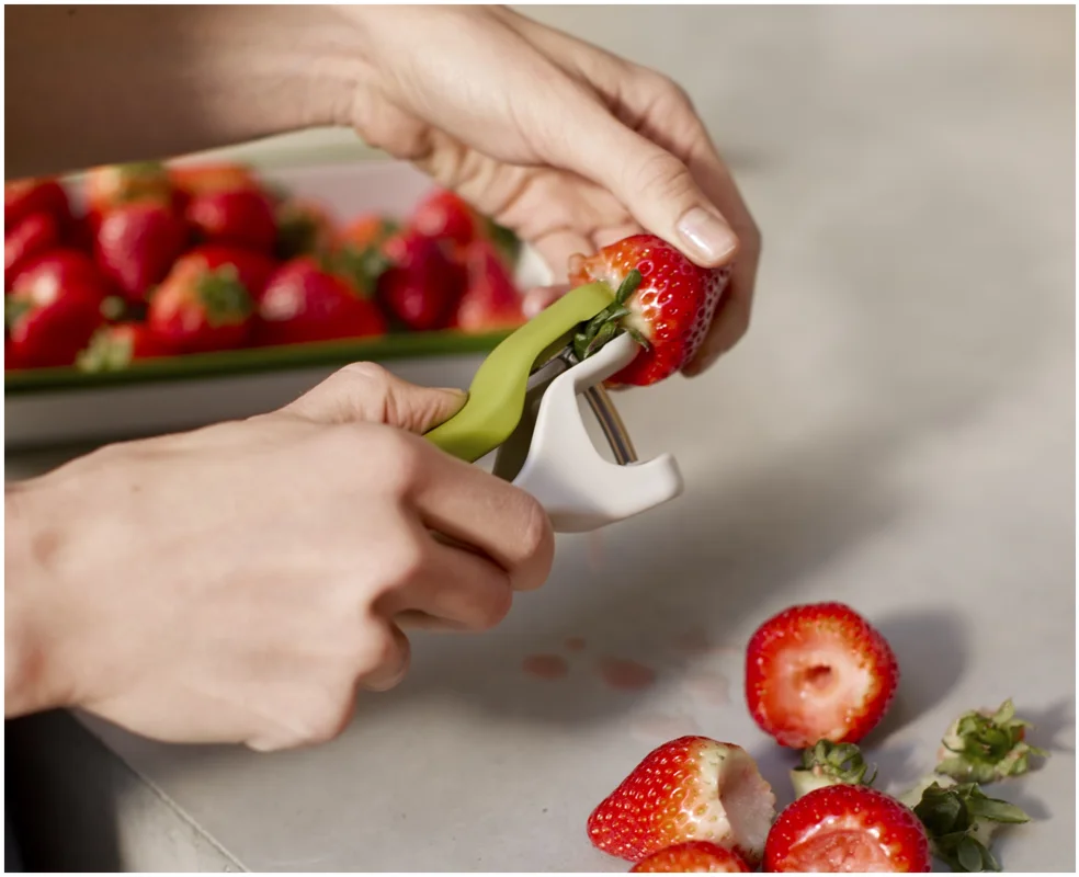 Das Vorbereiten von Früchten kann knifflig sein, besonders beim Entstielen von Erdbeeren oder Entsteinen von Kirschen mit scharfen Messern. Dieses 2-in-1-Werkzeug bietet eine sichere und effiziente Lösung, die diese Aufgaben schneller und sauberer macht. Es verfügt über ein robustes Entstein-Werkzeug und eine pinzettenartige Vorrichtung zum Entfernen von Stielen und Strünken auch für einige Oliven geeignet. Beide Werkzeuge sind sicher und einfach zu bedienen und lassen sich anschliessend leicht reinigen.